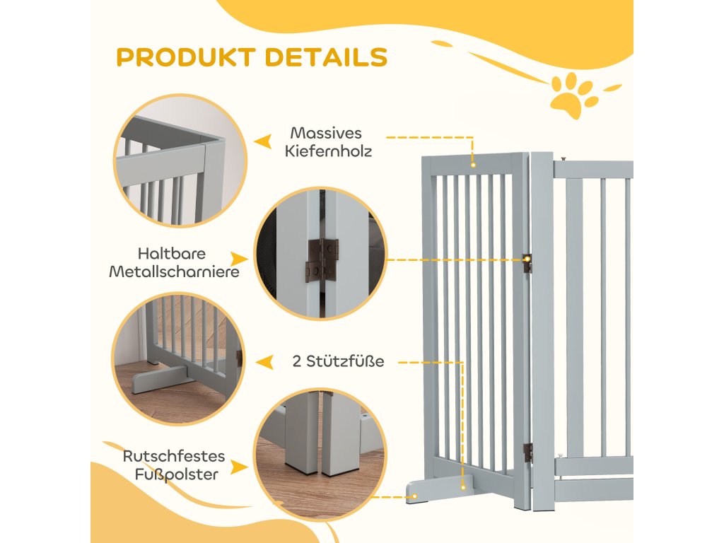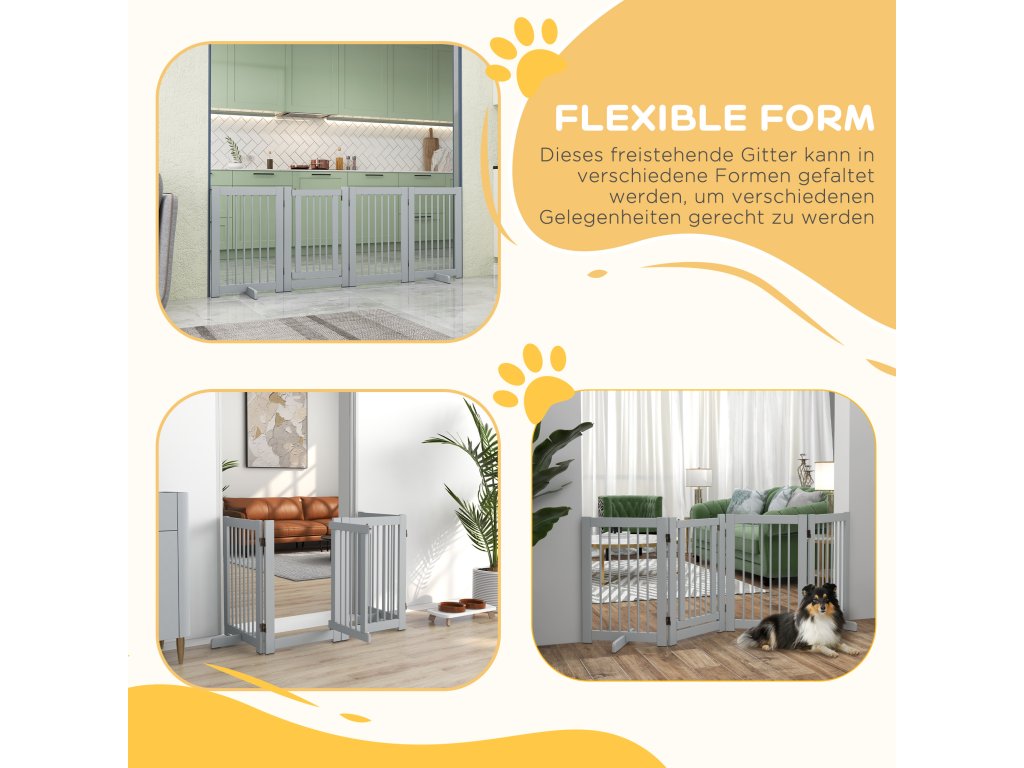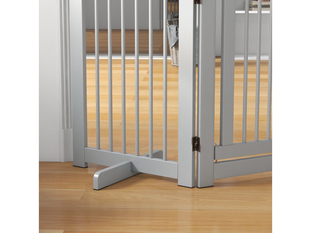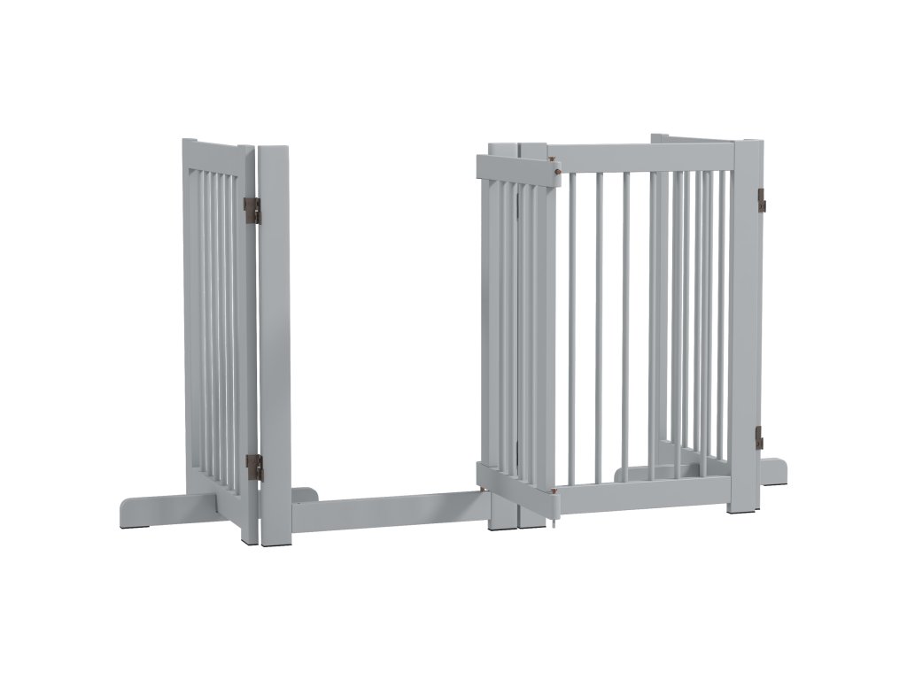 PawHut Volně stojící brána pro psy, 4 panely, flexibilní, borovicové dřevo, 204L x 36W x 75H cm, světle šedá