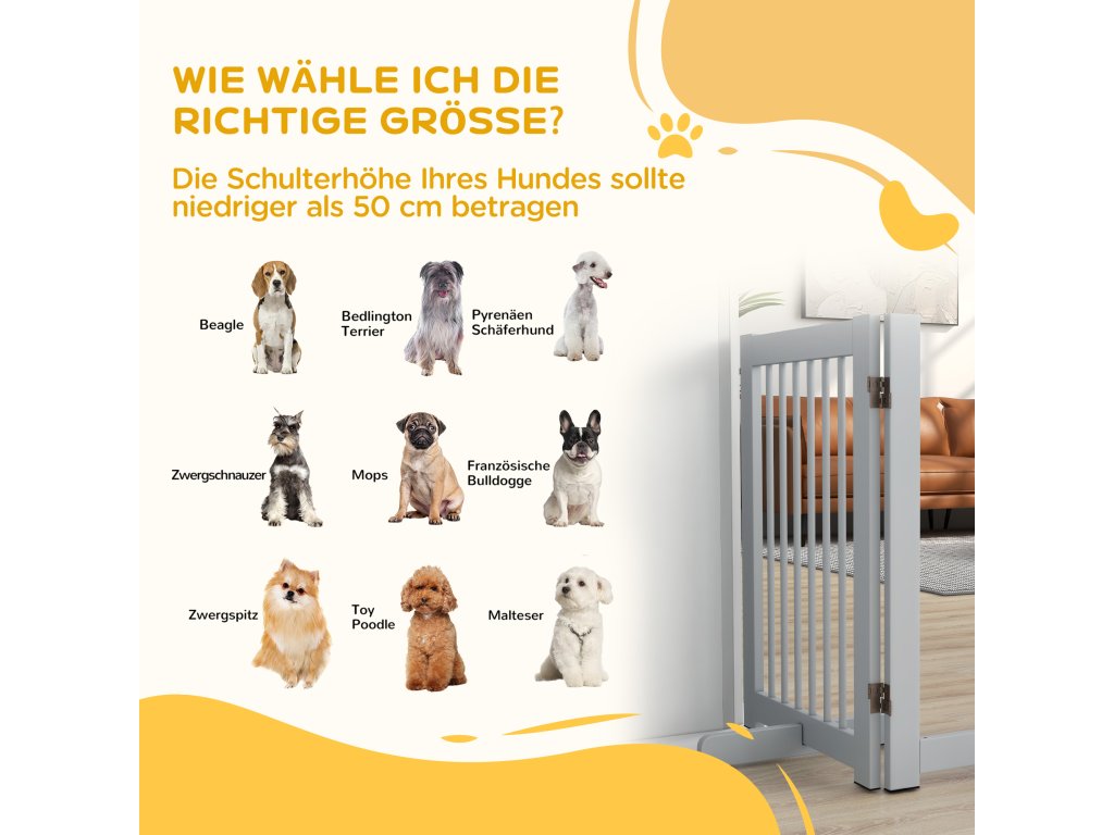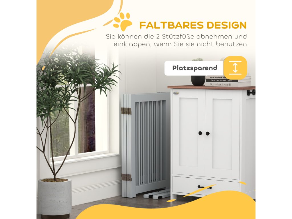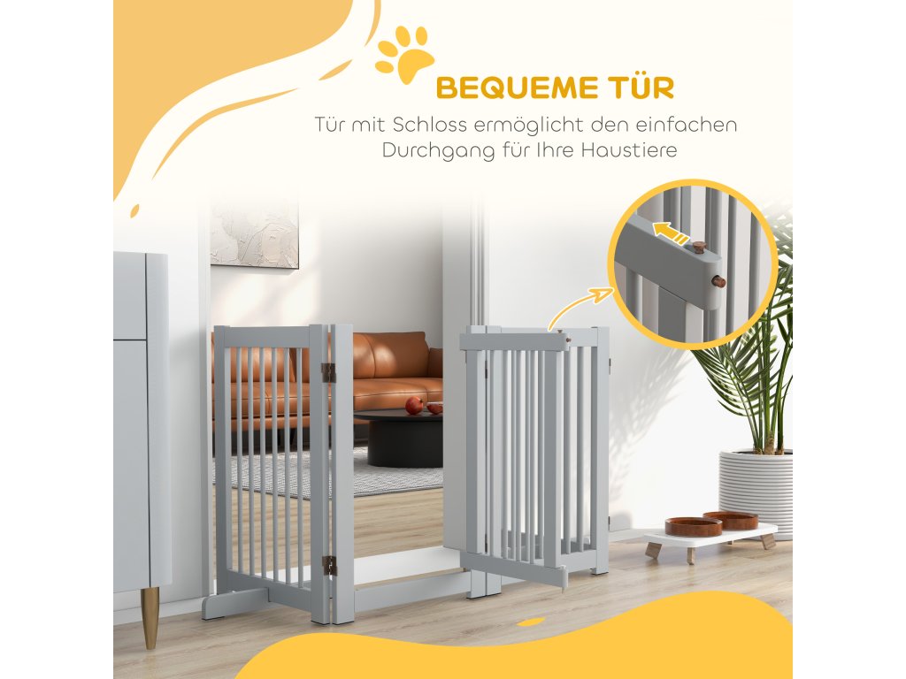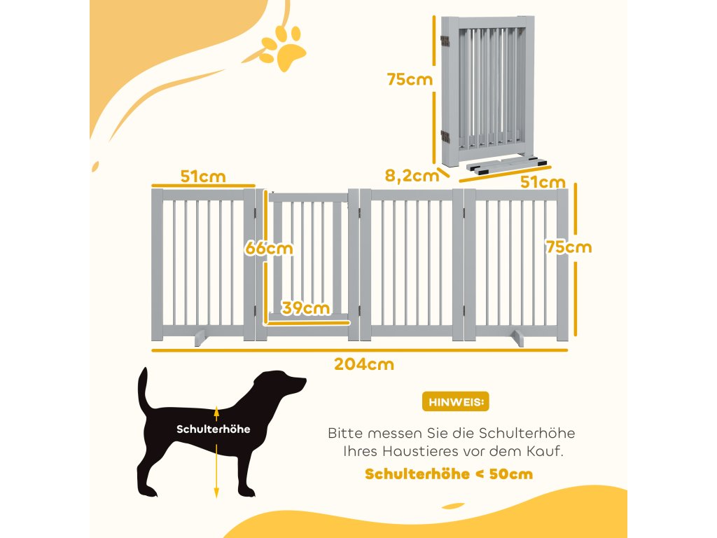 PawHut Volně stojící brána pro psy, 4 panely, flexibilní, borovicové dřevo, 204L x 36W x 75H cm, světle šedá