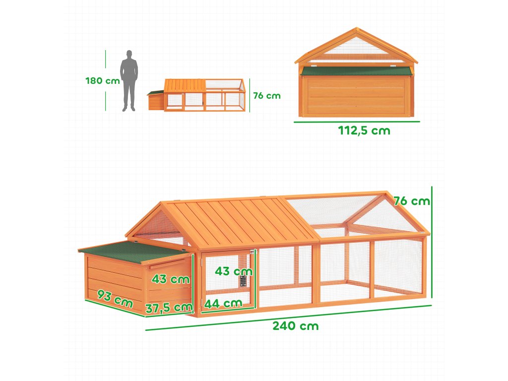 Rozměry výběhu pro kuřata: 240D x 112,5Š x 76V cm. Vhodné pro 4-8 kuřat. Nutná montáž.