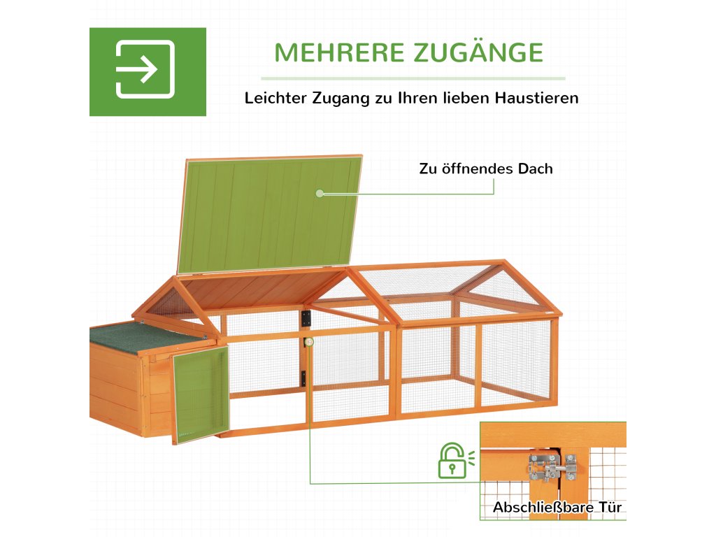 Kurník PawHut poskytuje malým zvířatům bezpečný a pohodlný domov. Až osm malých zvířat si zde může užívat bezpečí a pohodlí, oplocených robustním drátěným pletivem. Díky velkým dveřím a výklopné střeše je krmení a čištění výběhu snadné. Kurník je flexibilně rozšiřitelný a lze jej kombinovat s dalšími kurníky pro ubytování více domácích mazlíčků.