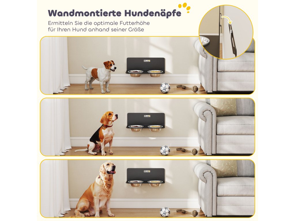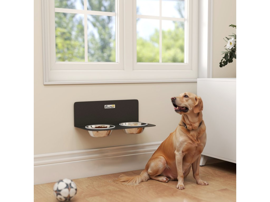 PawHut výškově nastavitelná nástěnná miska pro psy se 2 miskami z nerezové oceli o objemu 800 ml, 42 x 23,5 x 14 cm, černá