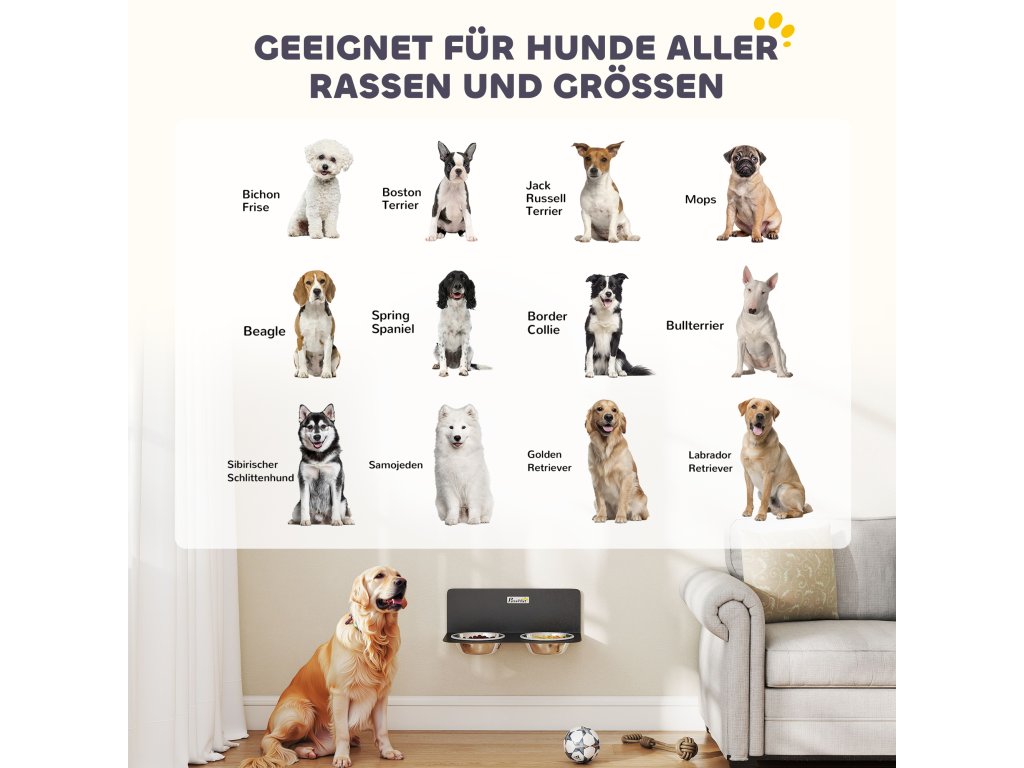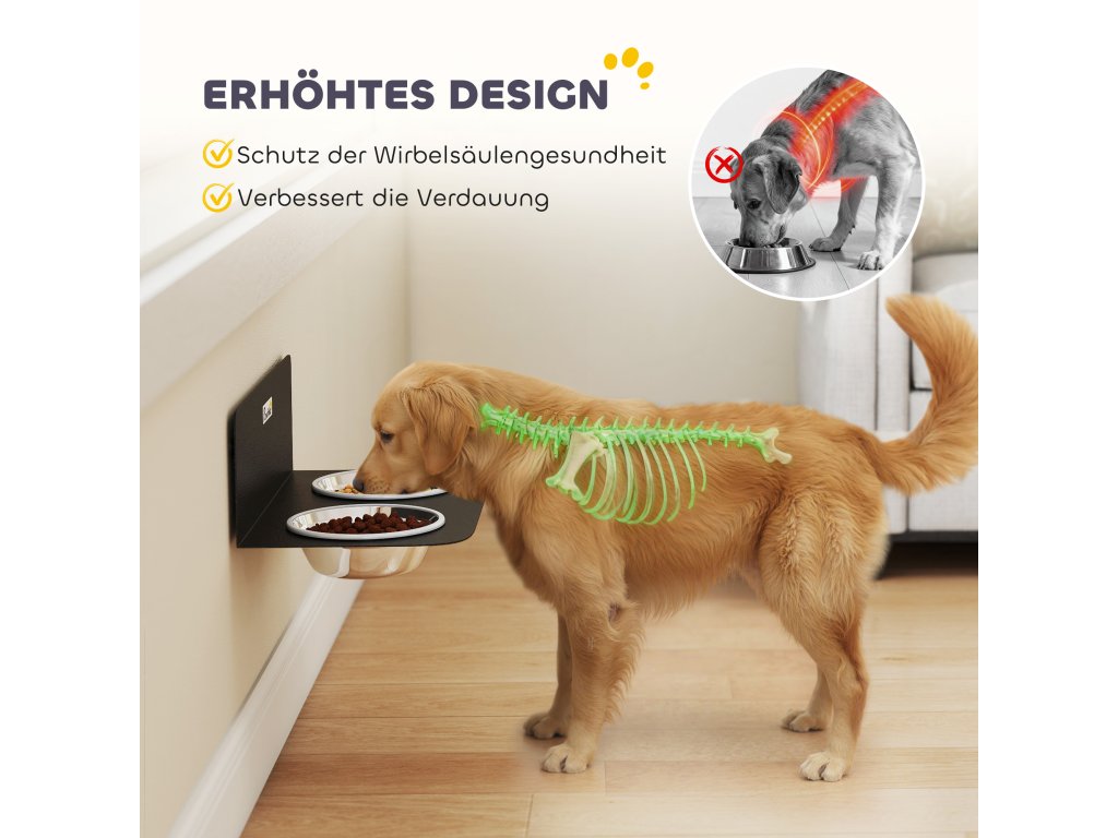 Už vás nebaví špinavé podlahy a váš pes se trápí s jídlem? Rozlitá voda a rozházené jídlo mohou váš uklizený domov rychle proměnit v nepořádek. Nástěnné misky pro psy PawHut zlepšují zážitek vašeho mazlíčka z jídla tím, že udržují pořádek. Plovoucí design krmné stanice podporuje zdravé držení těla a usnadňuje úklid pod ní, čímž navrací vašemu domovu klid.