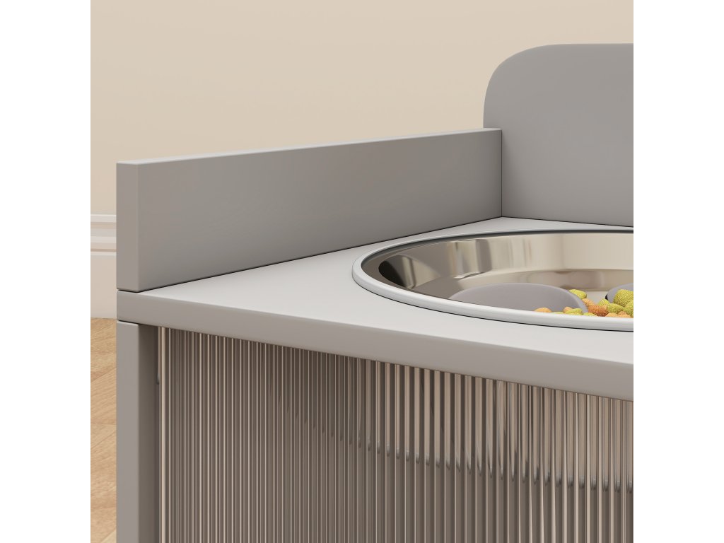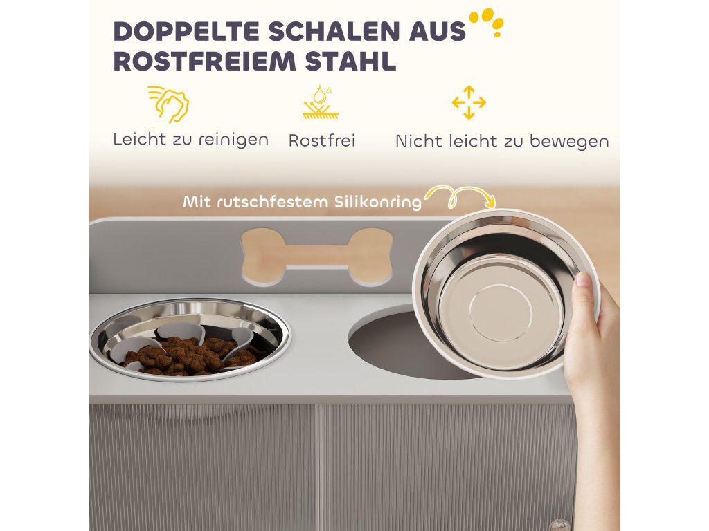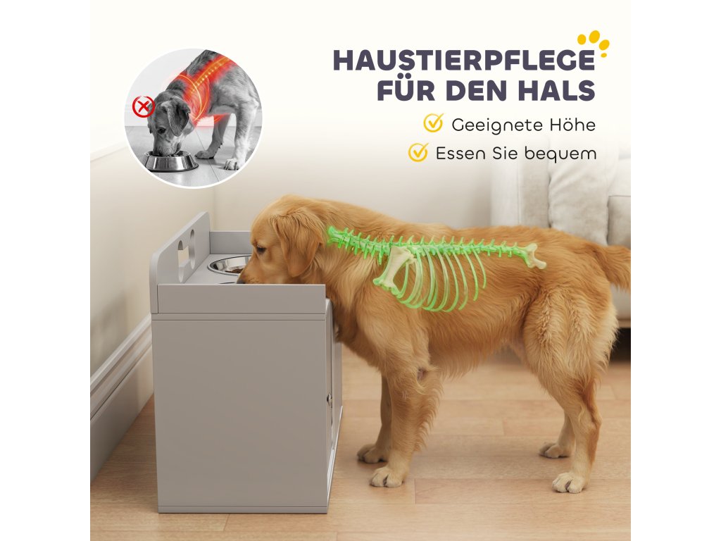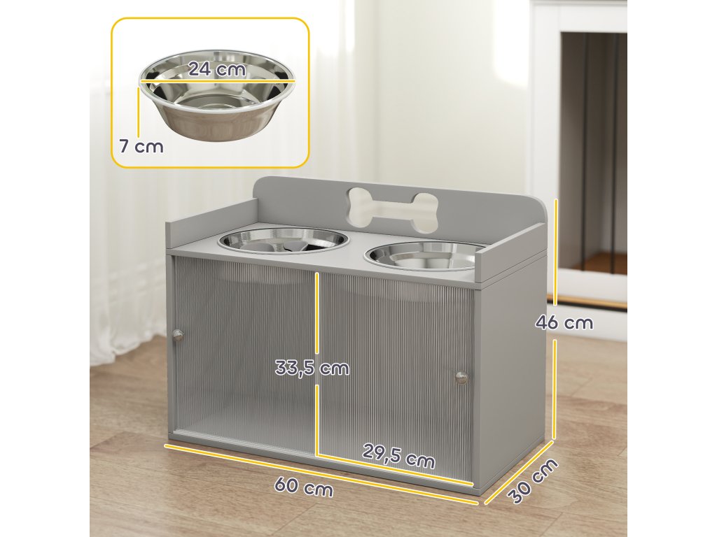 PawHut Vyvýšená krmná stanice se 2 miskami a skříňkou, MDF, nerezová ocel, kostěný vzor, šedá