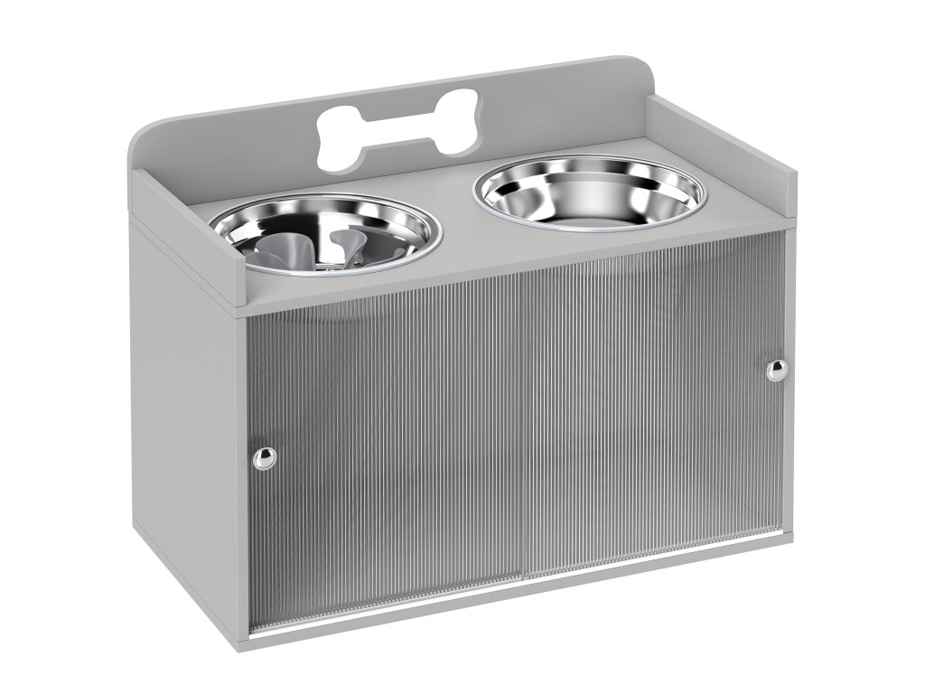 Moderní design domácnosti: Vyvýšená miska pro psy, navržená v jemné šedé barvě s atraktivními výřezy ve tvaru kostí a stylovými akrylovými dvířky, doplní každou místnost teplou a příjemnou atmosférou.