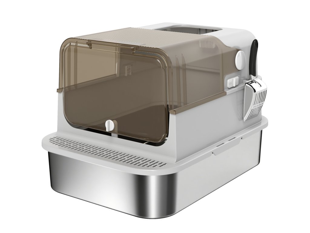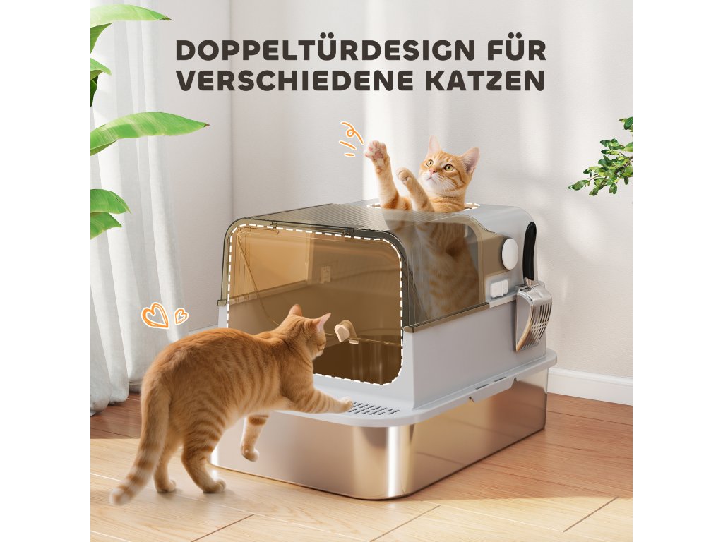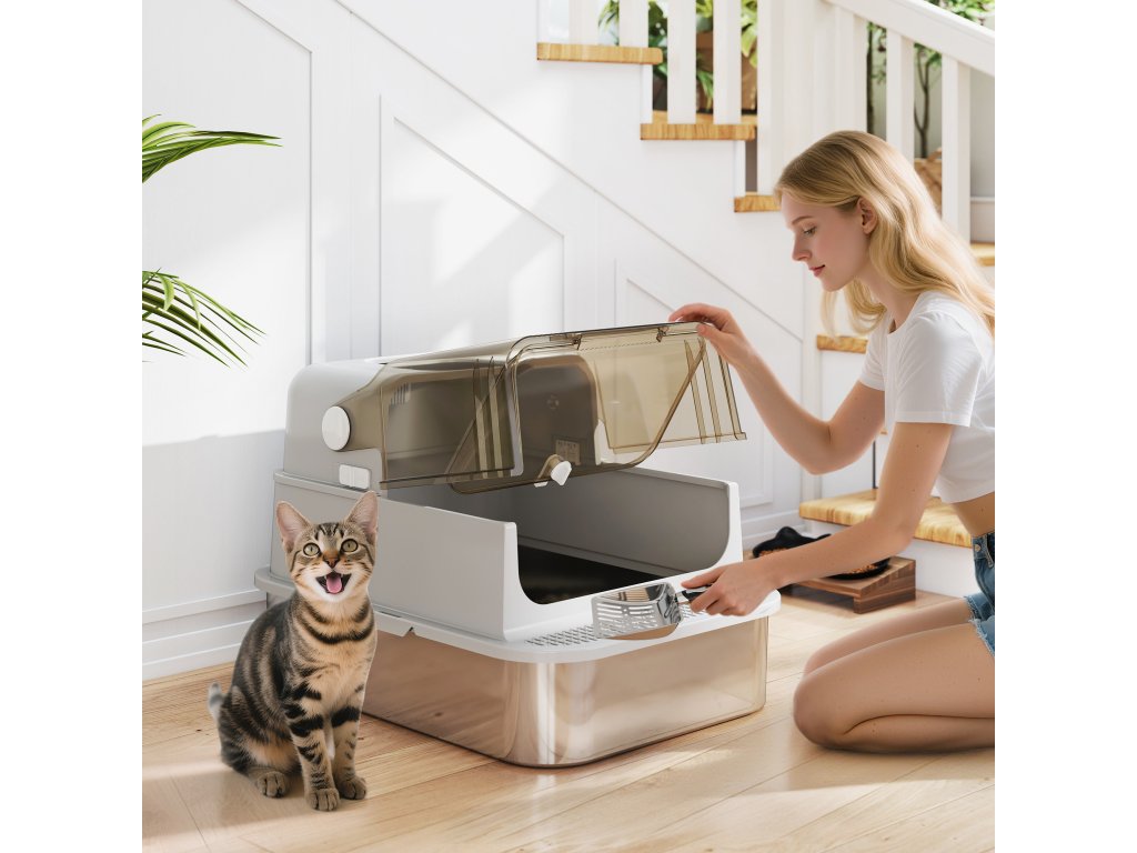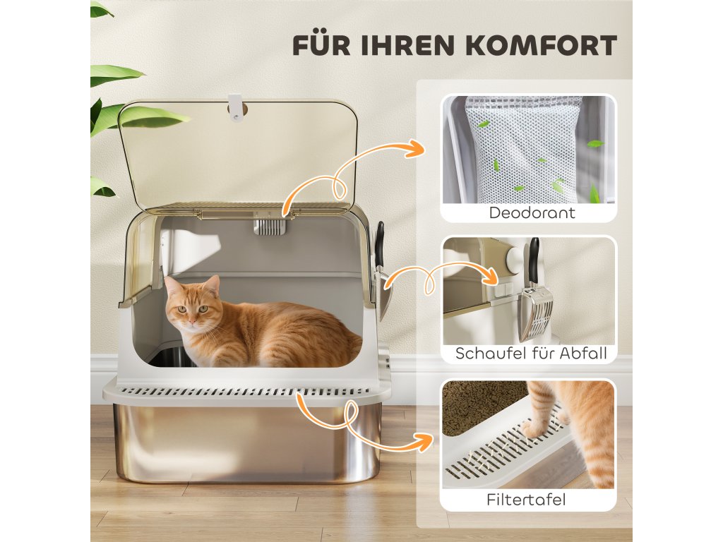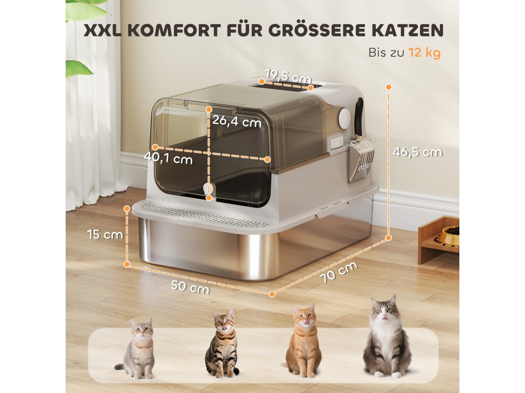 PawHut XXL nerezová kočičí toaletní miska s víkem na výklop, s lopatkou, pro velké kočky do 12 kg, snadno se čistí