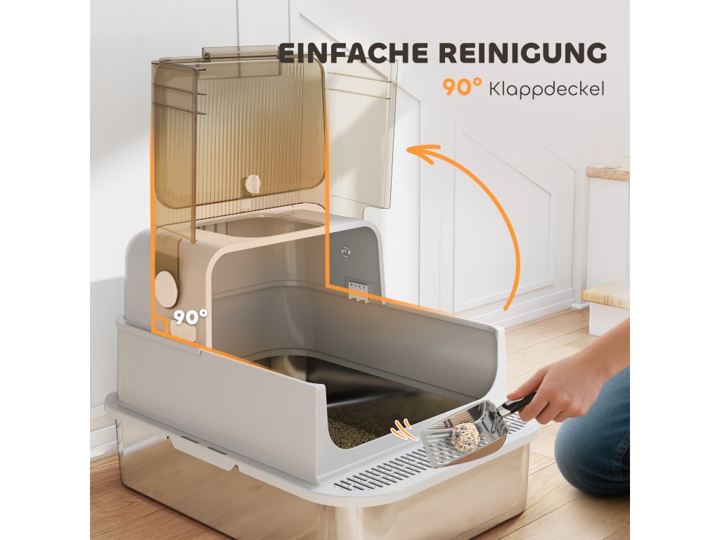 Snadnější údržba: Přední víko s výklopnými panty o 90° této kočičí toalety z nerezové oceli umožňuje rychlé a snadné čištění. Přední filtrační panel zachycuje stelivo z kočičích tlapek a dodávaná lopatka na stelivo usnadňuje čištění.