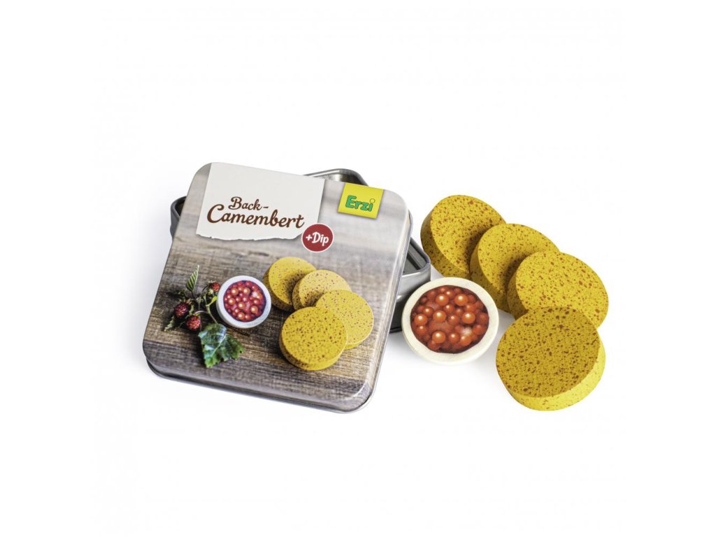Pečený sýr camembert s brusinkovým dipem ze dřeva v plechové dóze.Rozměry (d x š x v) cm / hmotnost: 9 x 9 x 2,8 / 106 g.Určeno pro věk: 3+.