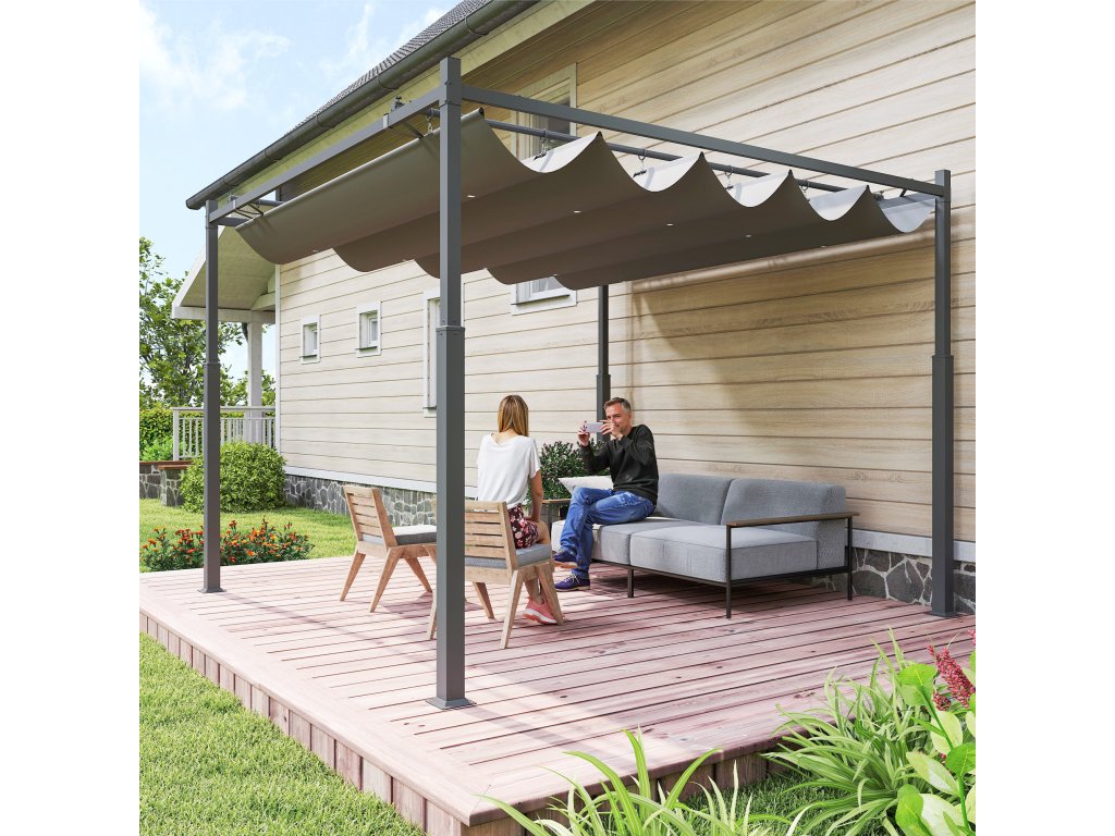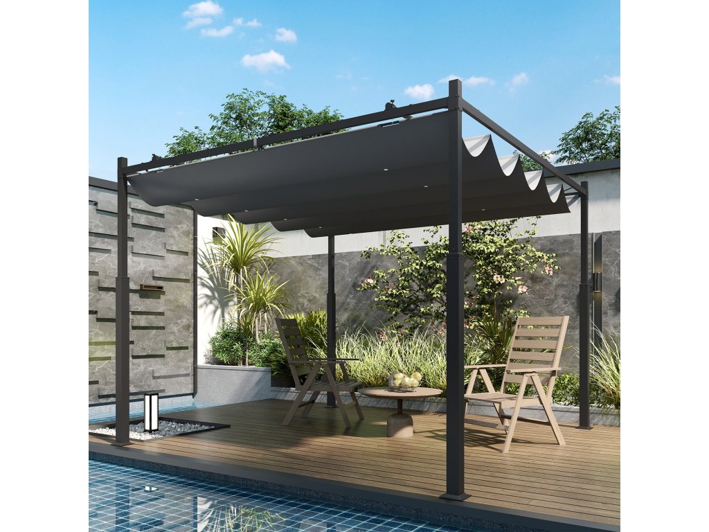 Pergola Outsunny, volně stojící zastřešená terasa cca 3x3 m s posuvnou střechou, magnetická podložka, sloupek 8 cm, UV odolný