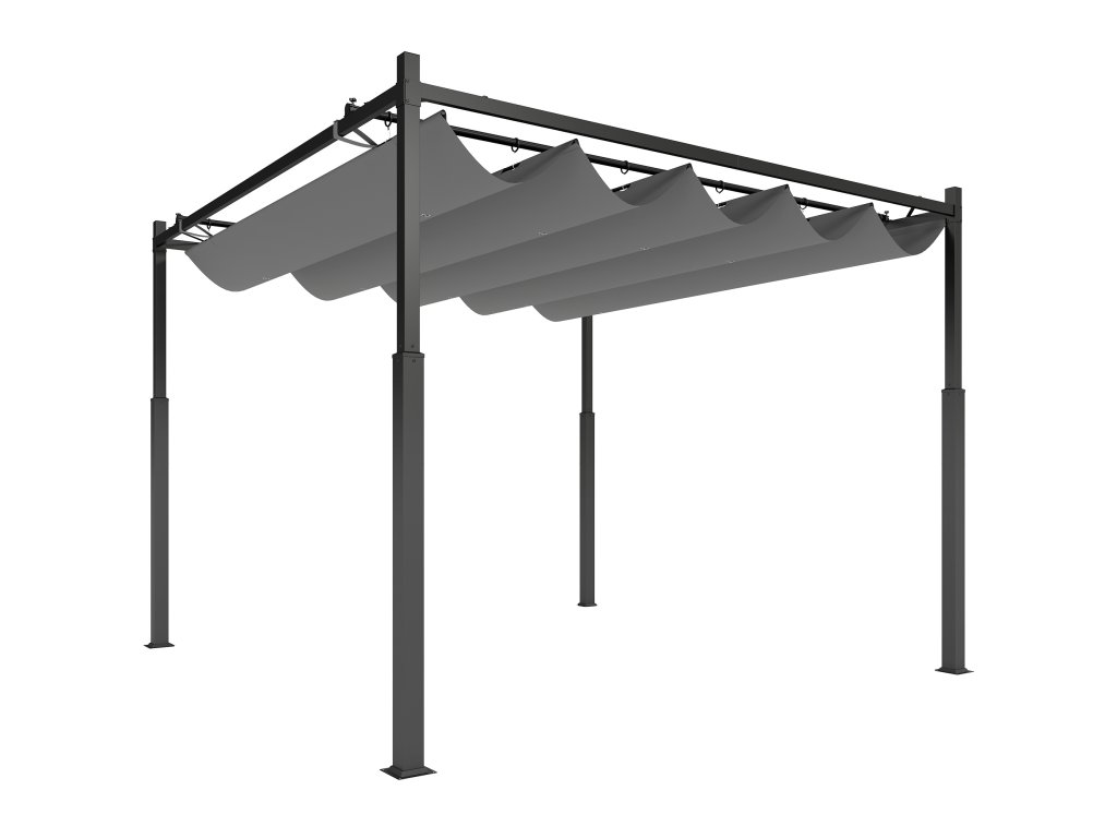 Výsuvná stříška: Pergola je vybavena výsuvnou stříškou s 180g PA povlakem, ochranou UPF30+ a magnetickou podložkou na jedné straně pro stabilní umístění. Není vhodná pro použití v extrémních povětrnostních podmínkách.