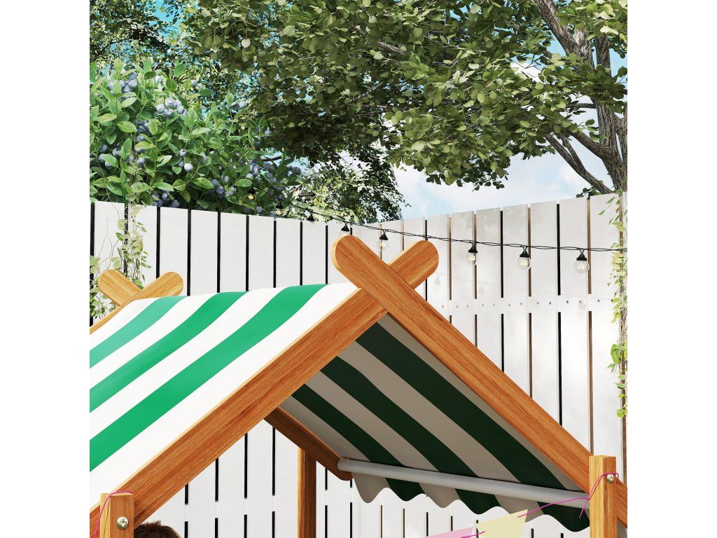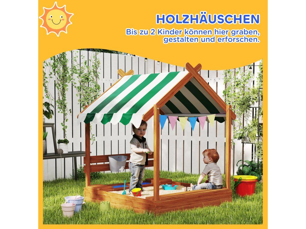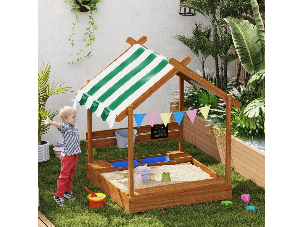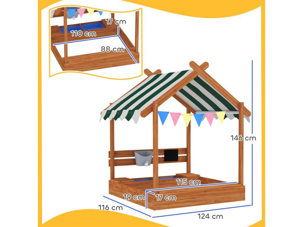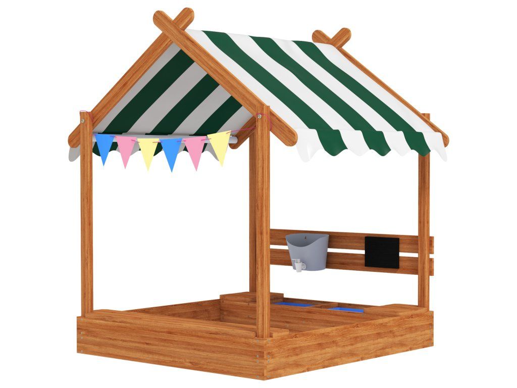 Pískoviště Outsunny se slunečníkem, design herního domečku, se sadou hraček, ošetřené masivní dřevo, 124 x 116 x 146 cm, zelené