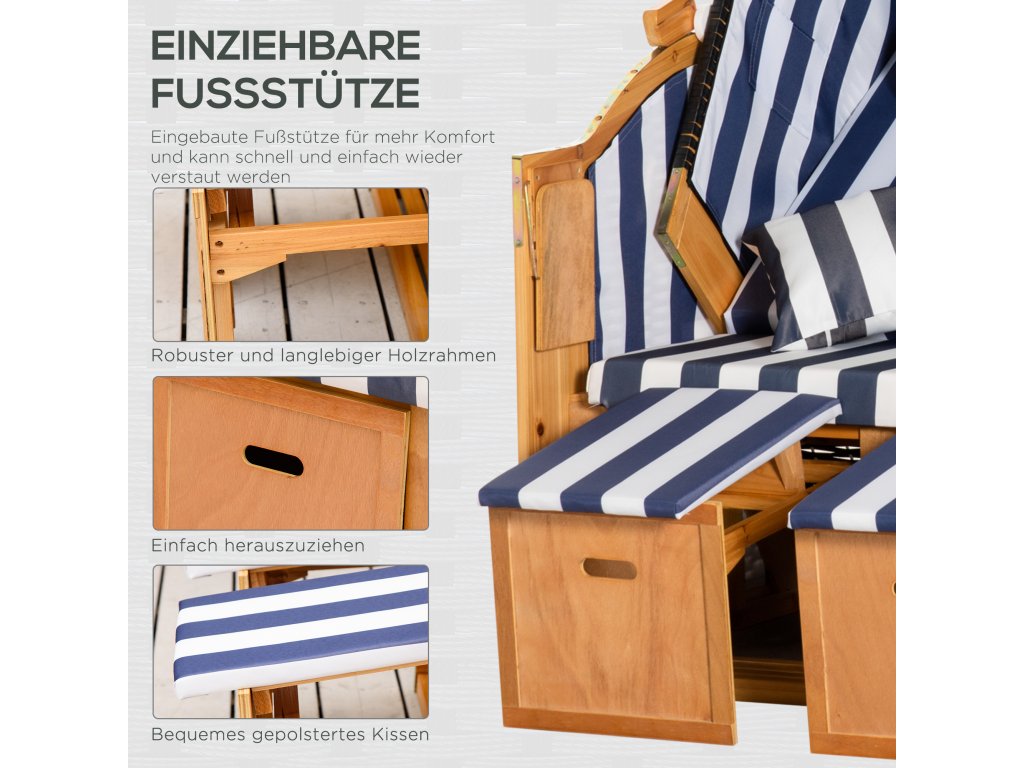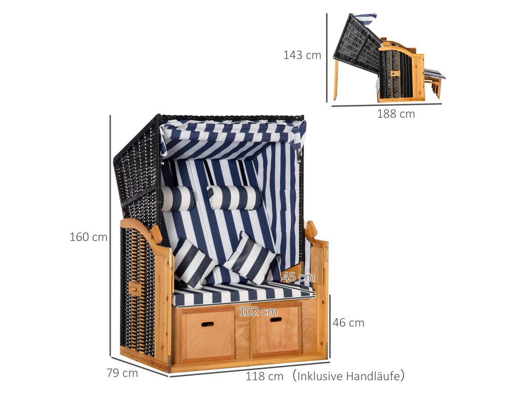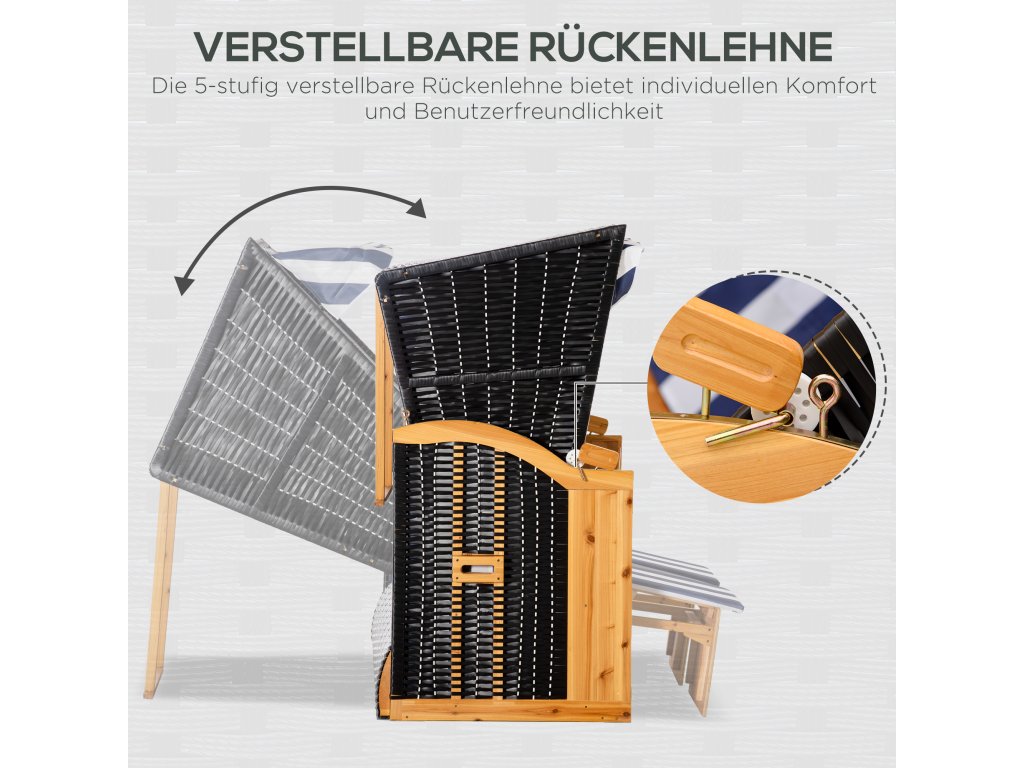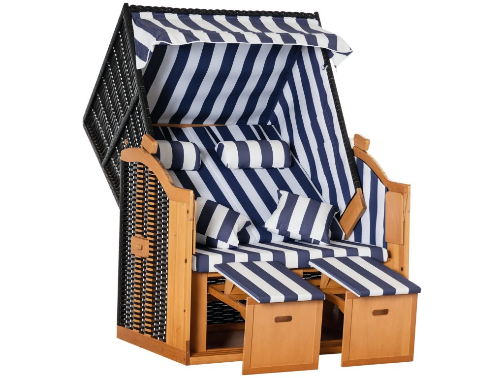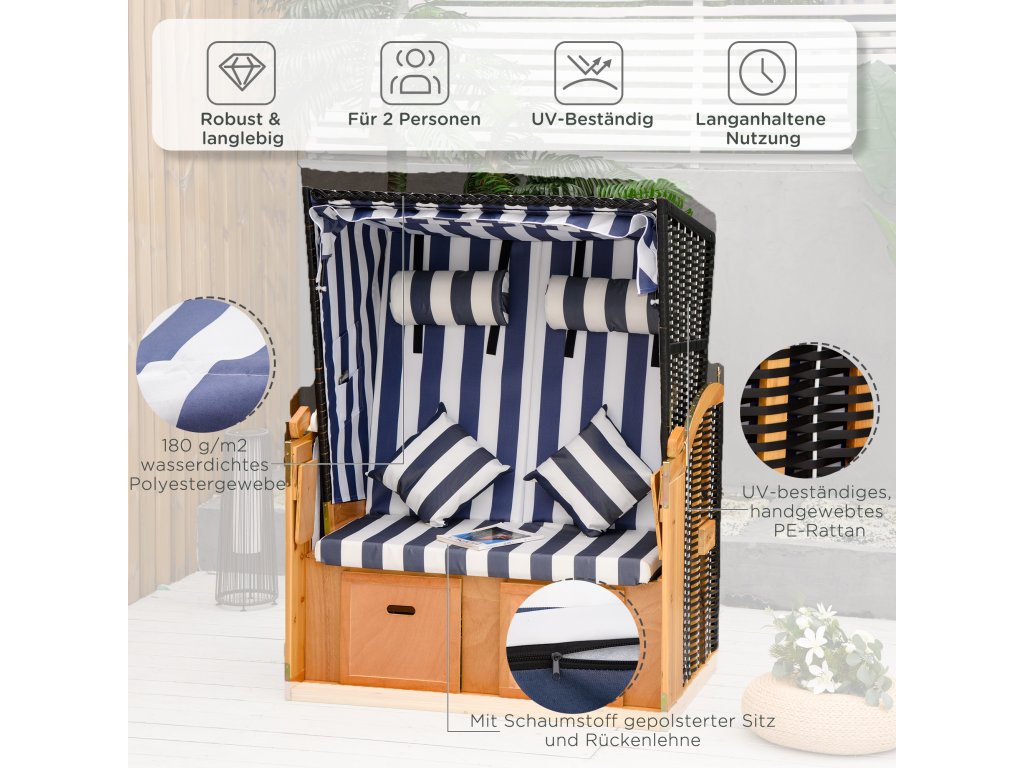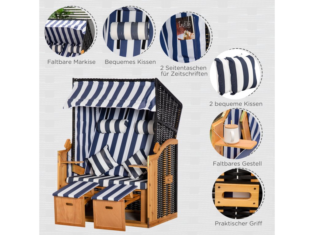 Stylové a pohodlné zároveň: Plážové křeslo Outsunny pro dva je skutečným poutavcem pozornosti. Vypadá stejně dobře na terase jako na zahradě a nabízí vše, co od plážového křesla očekáváte na dovolené: dva praktické skládací stolky, výsuvné opěrky nohou, zasouvací sluneční clonu a opěradlo nastavitelné do více poloh. Přeneste si autentickou atmosféru pláže a dovolené přímo k sobě domů.