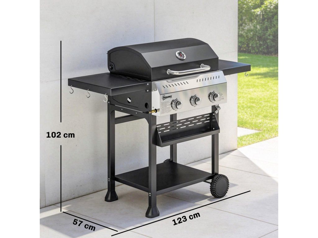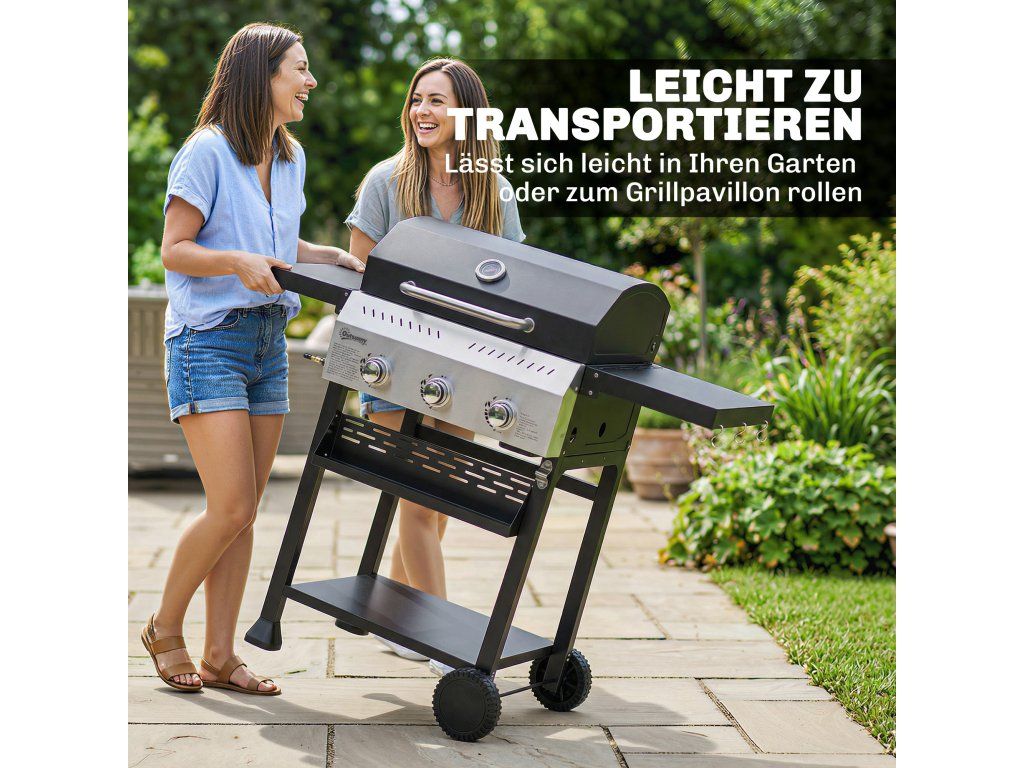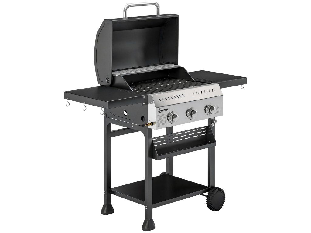 Plynový gril Outsunny, 9 kW, 3 hořáky, grilovací vozík, nerezová ocel, včetně skládacího bočního stolku, držáku na koření, spodní police, 6 háčků