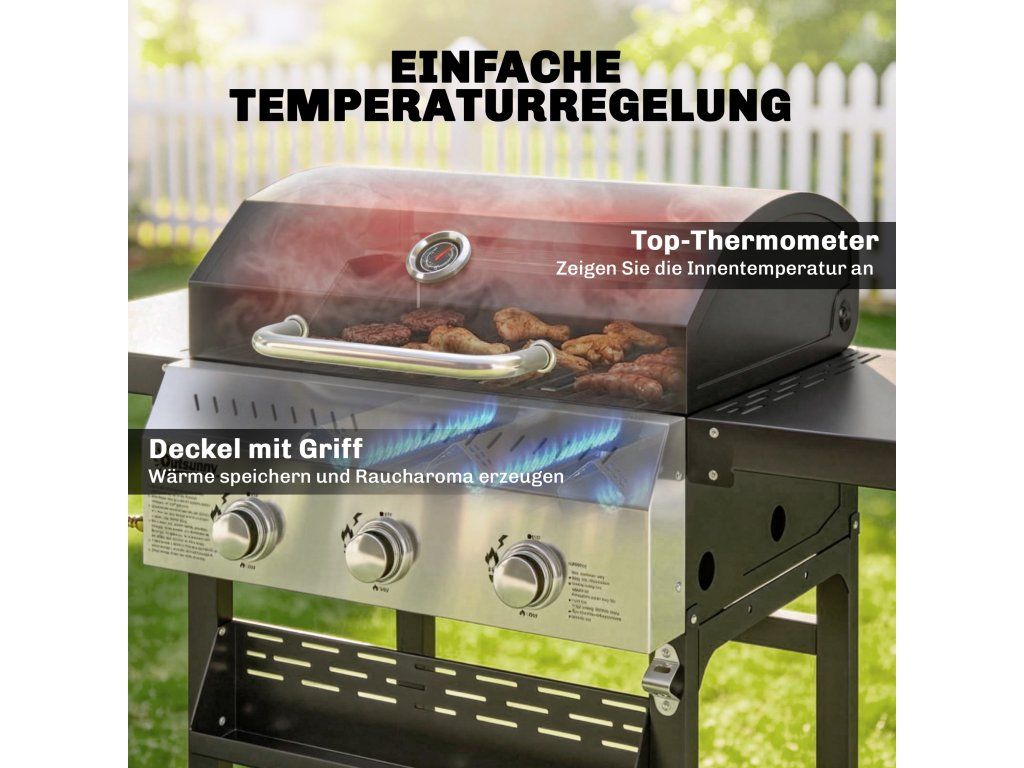 Vysoce výkonné hořáky: Tři výkonné 3kW hořáky z nerezové oceli zajišťují rychlý ohřev, což vám umožňuje efektivně připravovat více pokrmů současně – ideální pro rodinné setkání nebo pohodové víkendové grilování bez dlouhých čekacích dob.