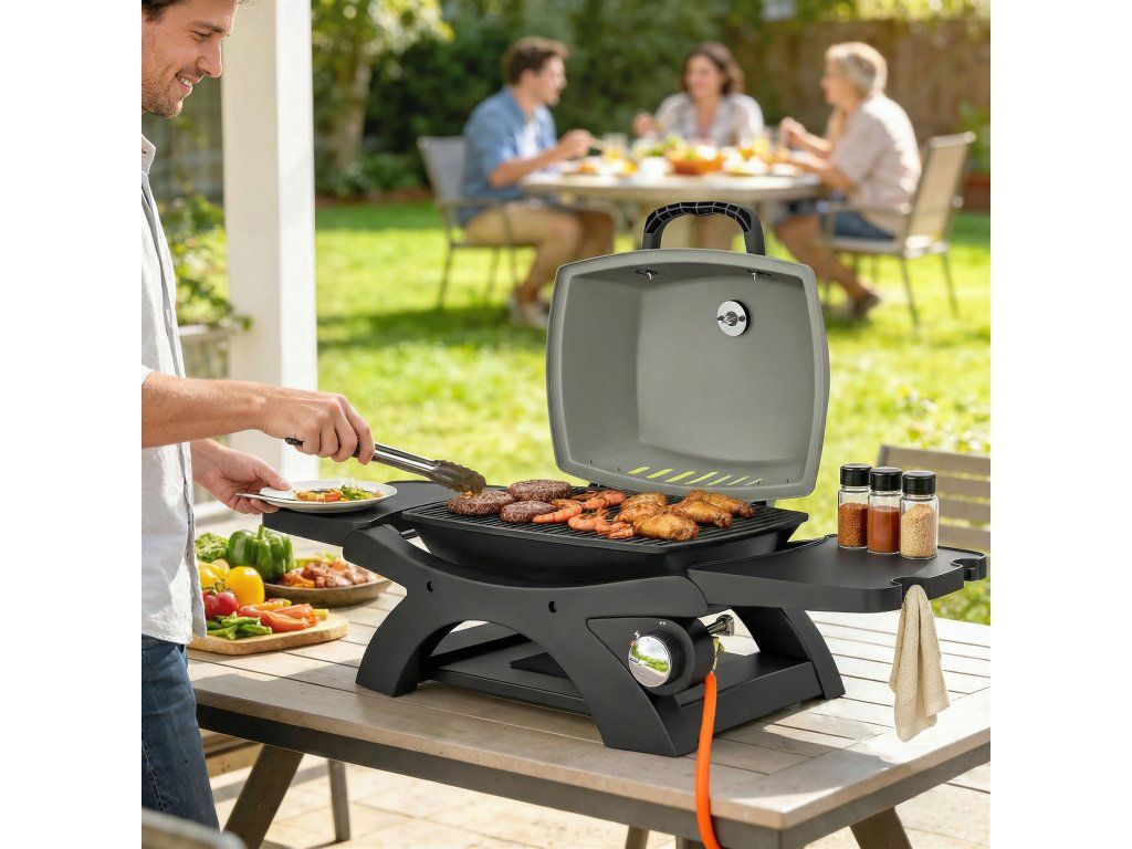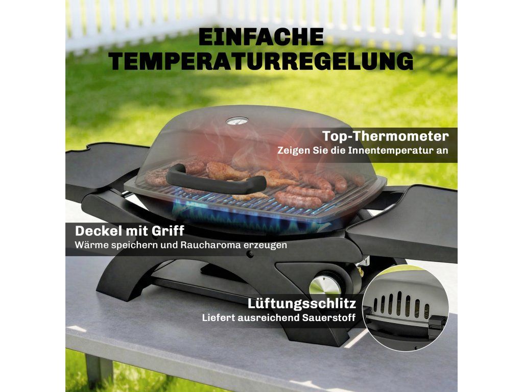 Plynový gril Outsunny 3,3 kW, stolní gril s 1 hořákem, skládací, boční stolky, litinové grilovací rošty, odnímatelná miska na tuk