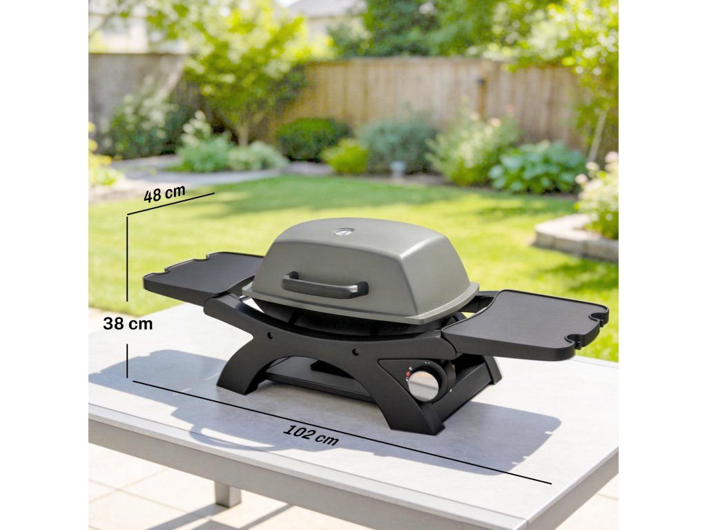 Navrženo pro přenosnost: Tento kompaktní stolní gril váží pouhých 12 kg a měří 59 x 48 x 38 cm bez bočních stolků, takže je snadno přenosný. Ideální pro použití na terase, při kempování nebo na plážových párty.