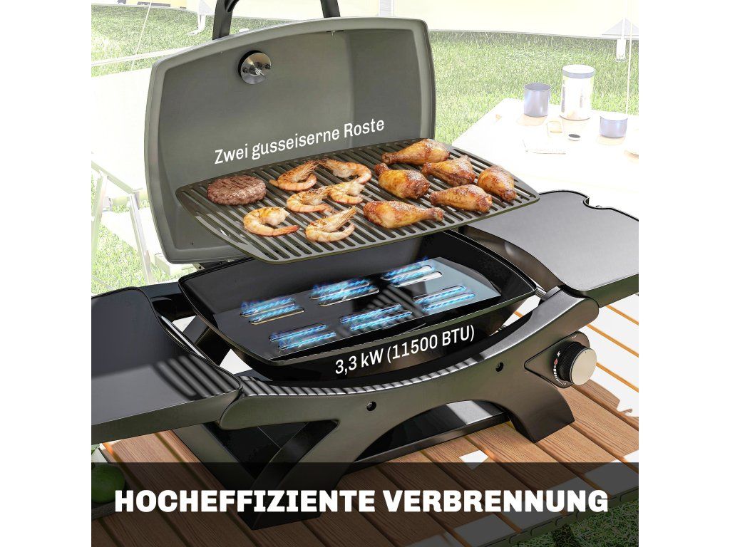 Efektivní grilování: Výkonný hořák o výkonu 3,3 kW (11 500 BTU) poskytuje intenzivní a rovnoměrné teplo, zatímco dva odolné litinové rošty ho optimálně udržují. Zapomeňte na vlažné výsledky – tento plynový gril zaručuje pokaždé lahodný a uspokojivý grilovací zážitek.