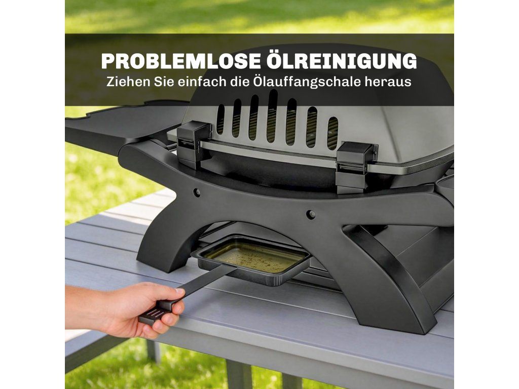 Odolný a snadno se čistí: Odnímatelná miska na tuk s rukojetí usnadňuje čištění. Robustní ocelové pouzdro a robustní nohy zajišťují odolnou a bezpečnou konstrukci, která vydrží i náročné grilovací podmínky.