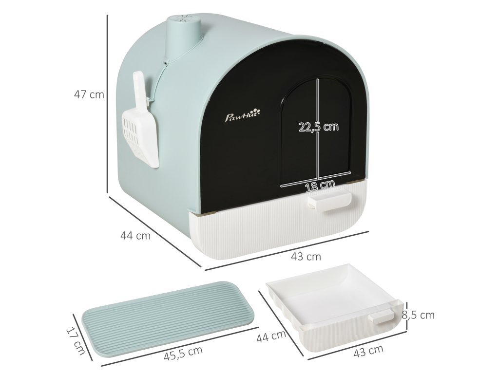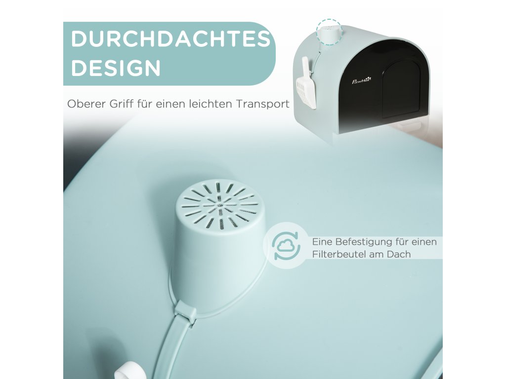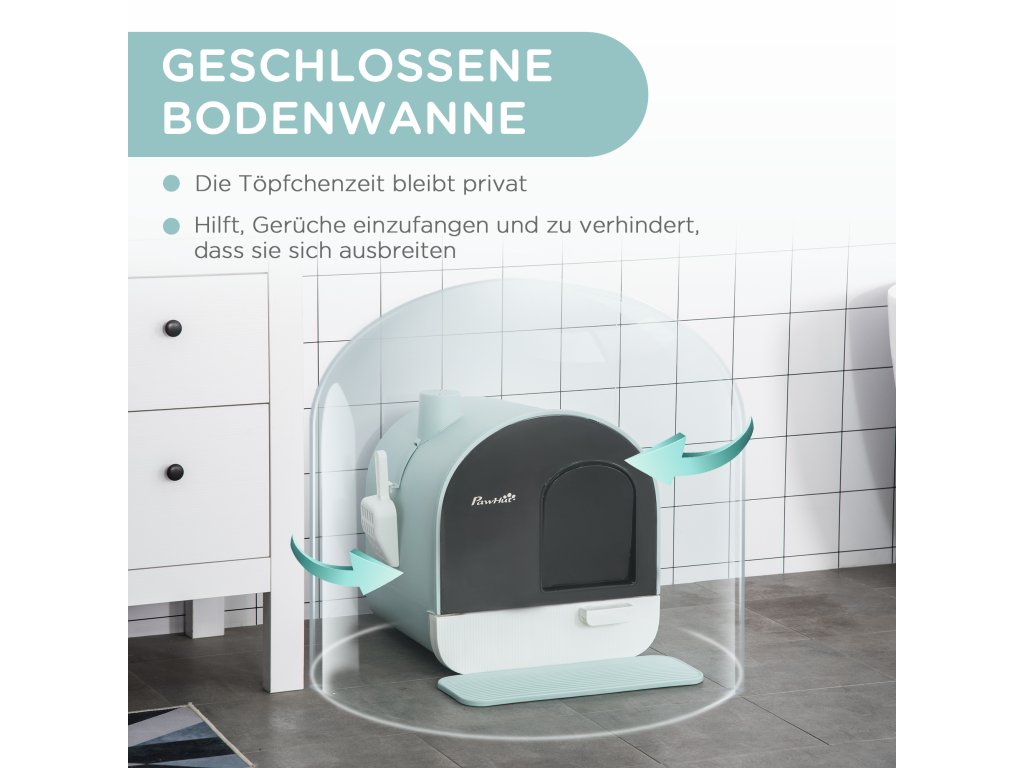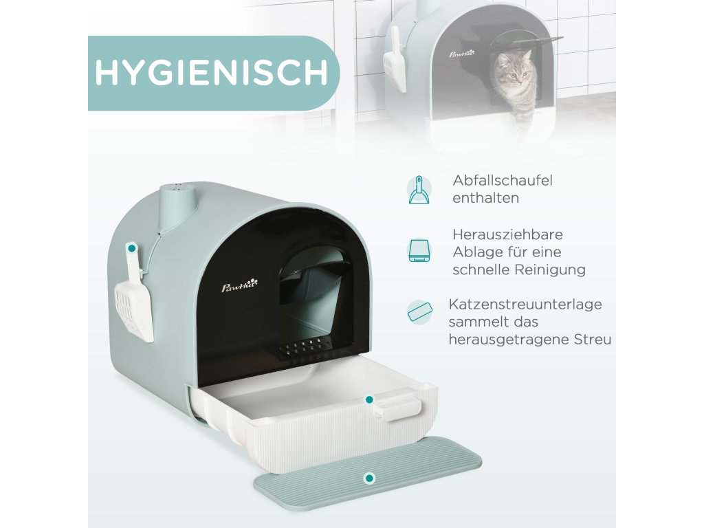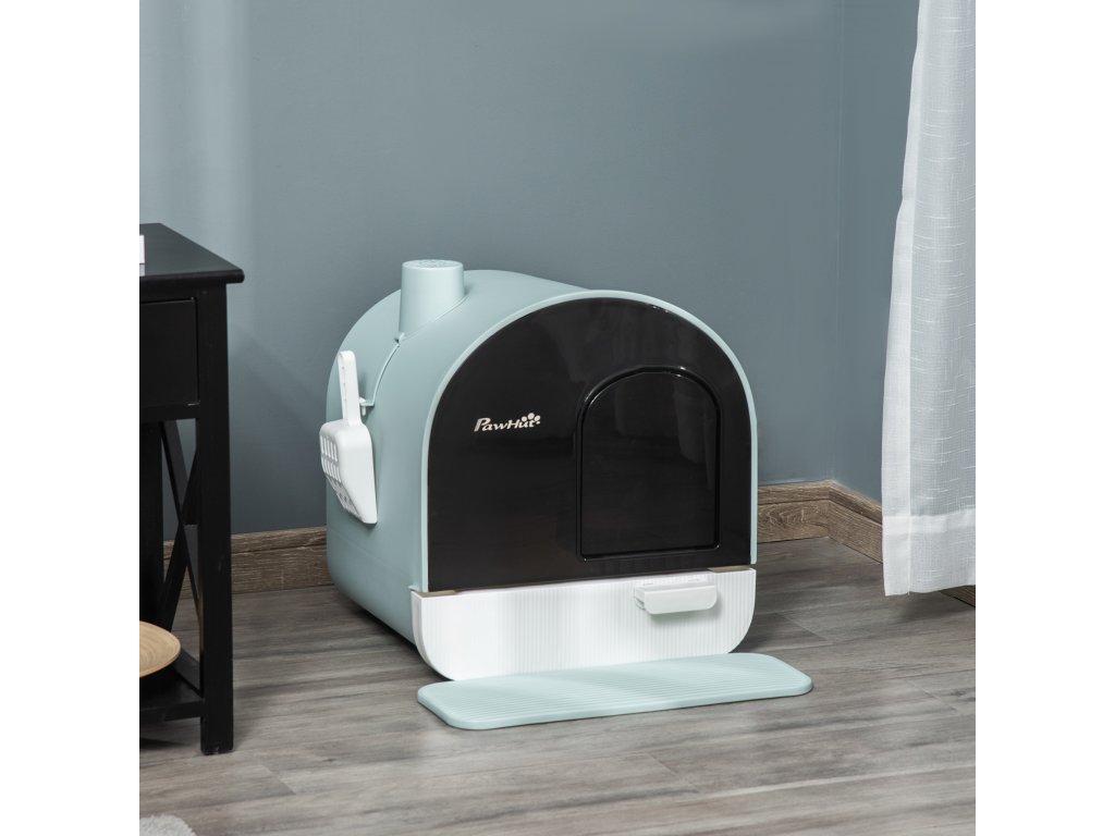 - Soukromá kočičí toaleta: Tato uzavřená toaleta nabízí vaší kočce chráněné místo pro její potřebu, zatímco integrované filtry minimalizují zápach a zajišťují příjemné vnitřní klima.
