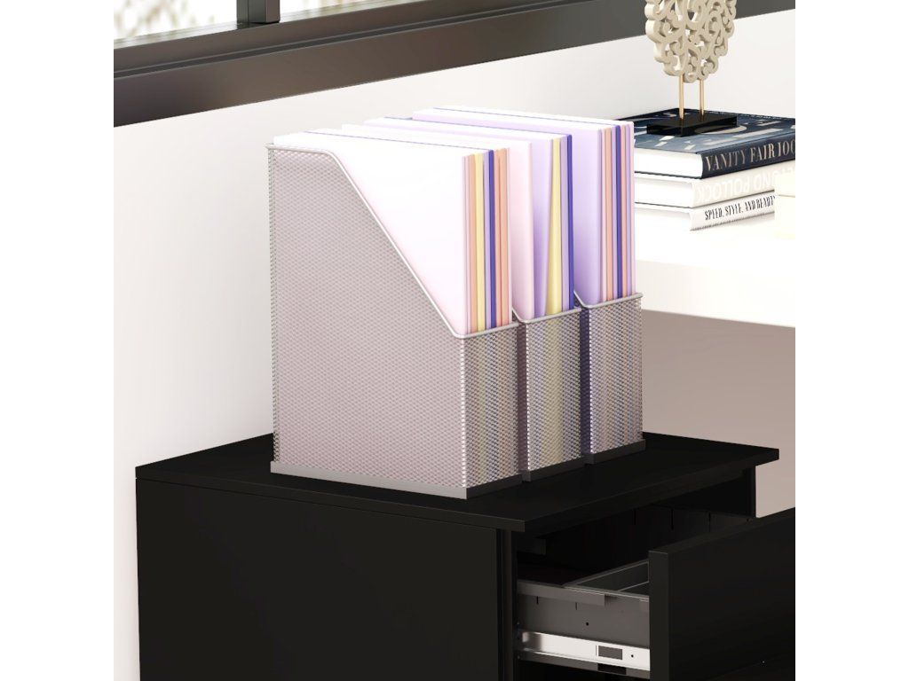 - Mějte vše uspořádané: Tato pojízdná kancelářská skříň se třemi zásuvkami vám nabízí další prostor pro uložení důležitých věcí i drobností, jako jsou sešívačky, nůžky nebo papír do tiskárny. Každá zásuvka má třístupňovou nastavitelnou lištu, takže do ní můžete zavěsit složky pro formát dopisů, A4 a Legal