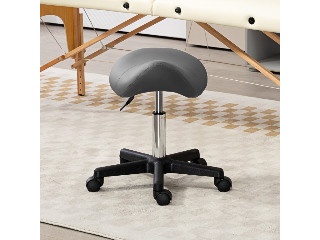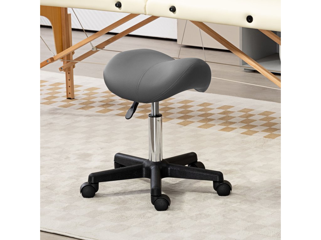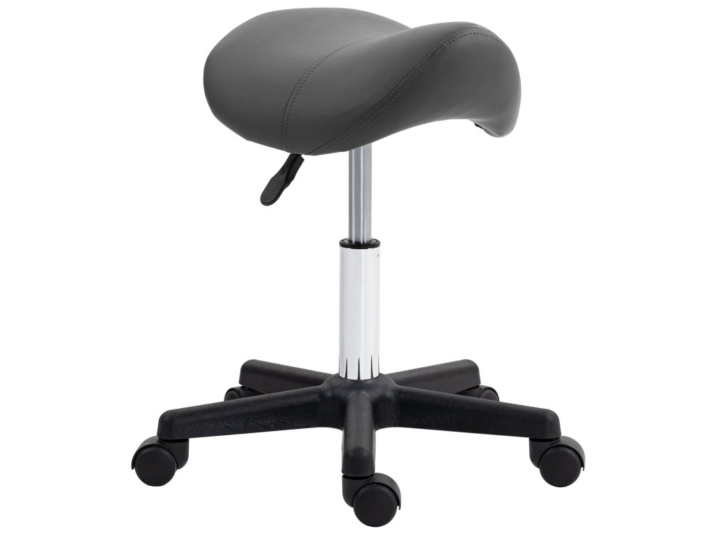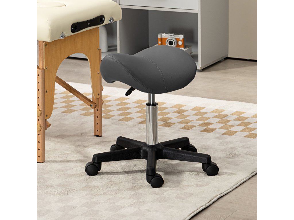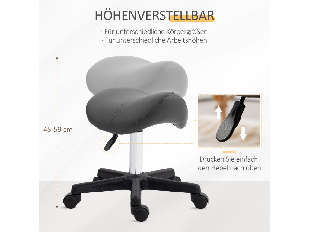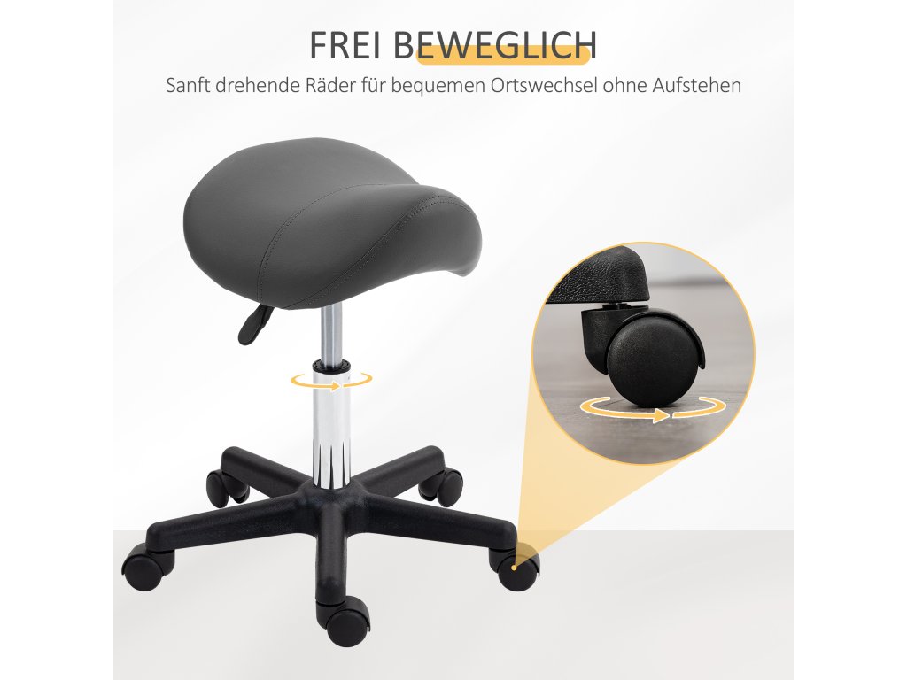 Pojízdná stolička HOMCOM, sedlo ve tvaru sedla, výškově nastavitelná, otočná o 360°, umělá kůže, šedá, 48 x 47 x 45-59 cm