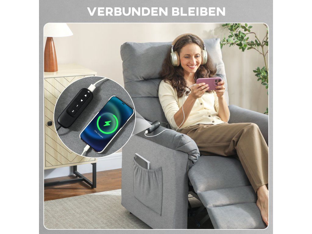 Nabíjení přes USB a pohodlné uložení: Port USB na dálkovém ovladači umožňuje nabíjet telefon/tablet během relaxace. Dvě boční kapsy na polohovacím křesle poskytují prostor pro dálkové ovladače, knihy a další předměty – vše snadno po ruce.