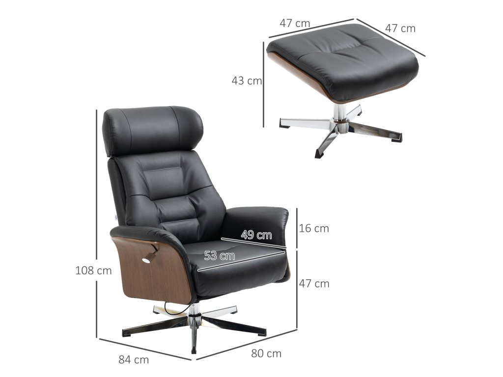 Polohovací křeslo HOMCOM s podnožkou, otočné o 360°, funkce polohování, čtecí křeslo, černé, 80 x 84 x 108 cm