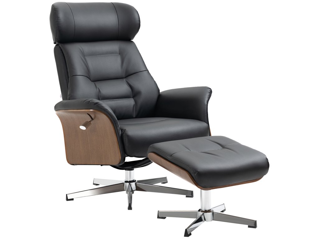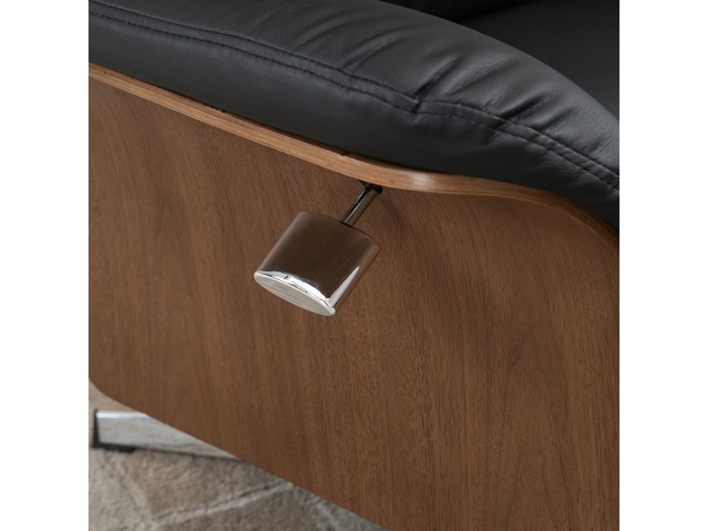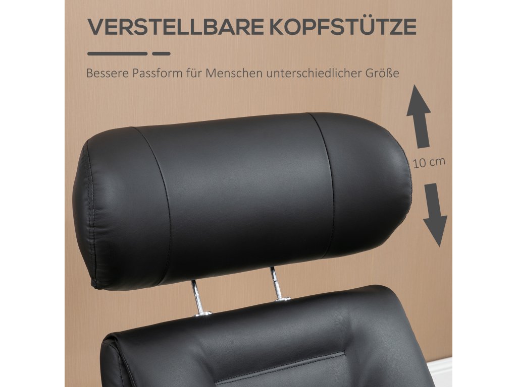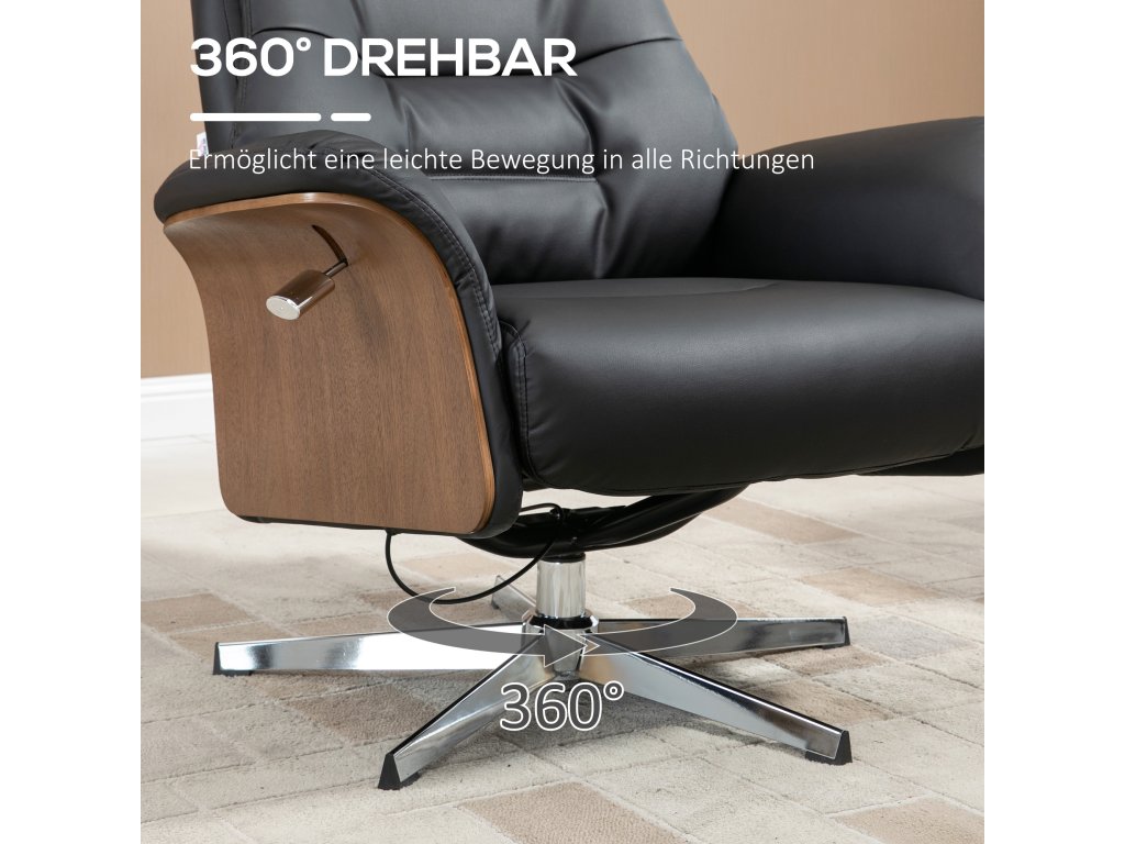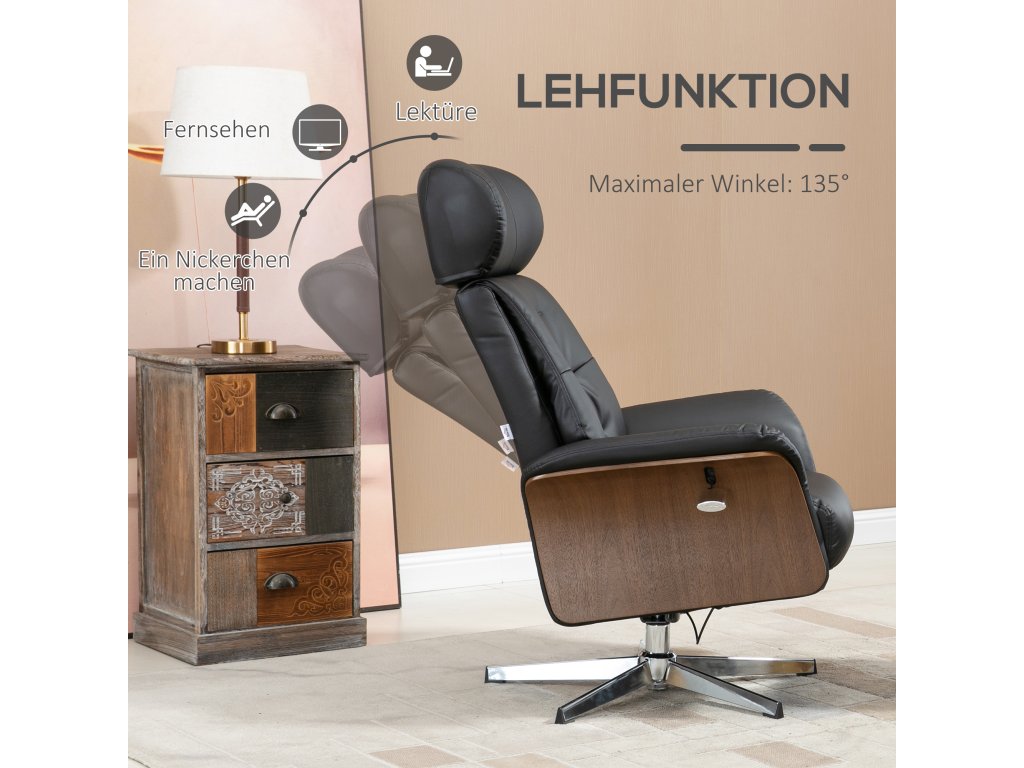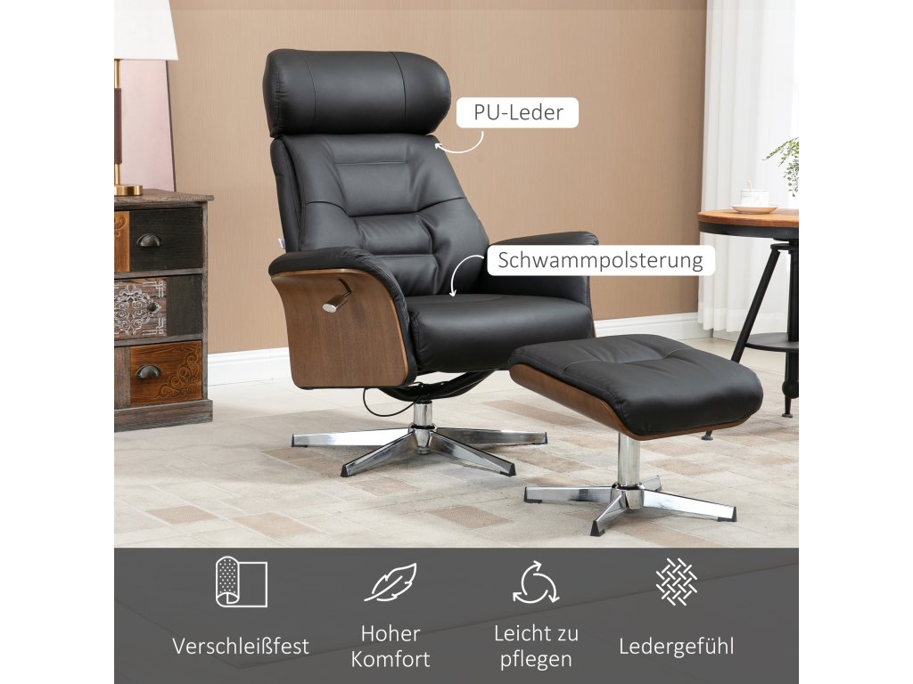 Opravdu poutavá kouzelná židle: Toto polohovací křeslo s podnožkou kombinuje moderní design a funkčnost. Černá umělá kůže, dřevěný rám a ocelová základna vytvářejí stylové akcenty.