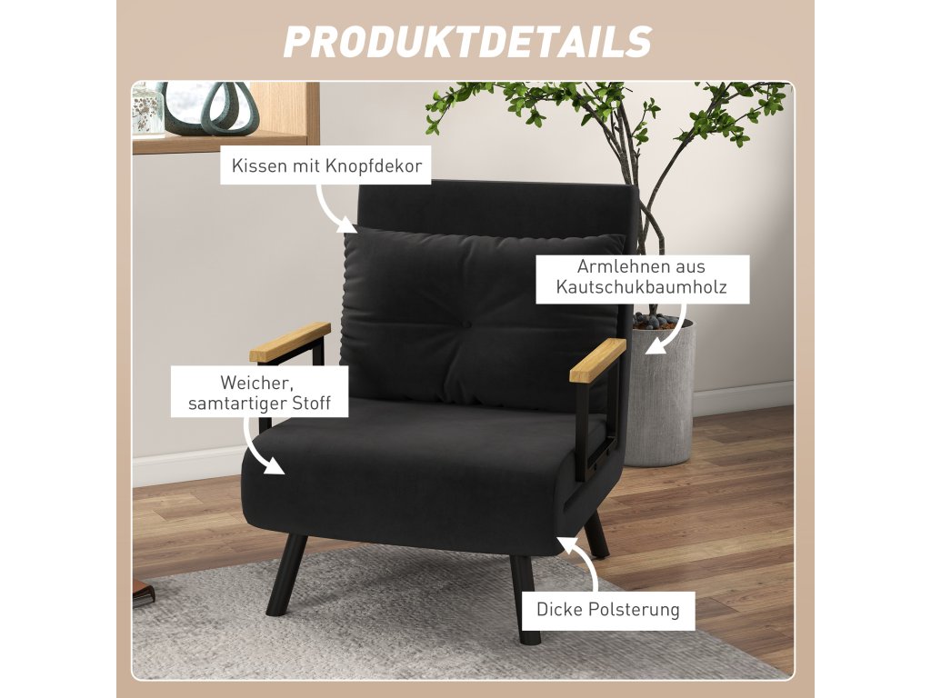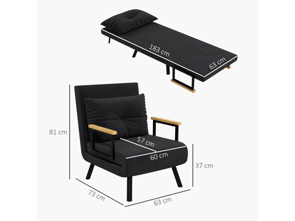 Objevte maximální pohodlí s rozkládacím křeslem HOMCOM, které se snadno převádí ze sedu do polohy pro spaní. Díky robustnímu ocelovému rámu a pětipolohovému nastavitelnému opěradlu si užijete nekompromisně stabilní a pohodlnou oporu. Plyšové polstrování, sametově měkké látkové čalounění a přiložený polštář zaručují výjimečný zážitek ze sezení. Přes den je ideální jako křeslo do obývacího pokoje a v noci jako pohodlná postel pro hosty.
