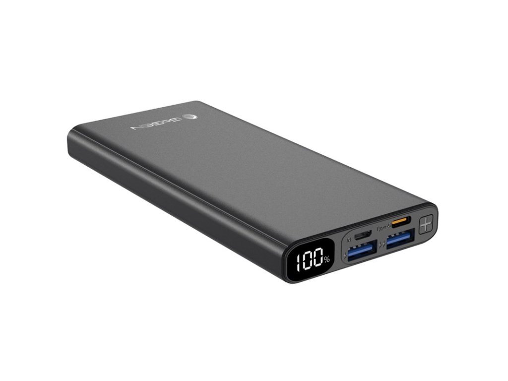 Power Bank GoGEN 10 000 mAh, vstupy micro USB / USB-C, výstupy USB-C / 2xUSB, Power Delivery, hliníkové provedení, LED displej, černá barva