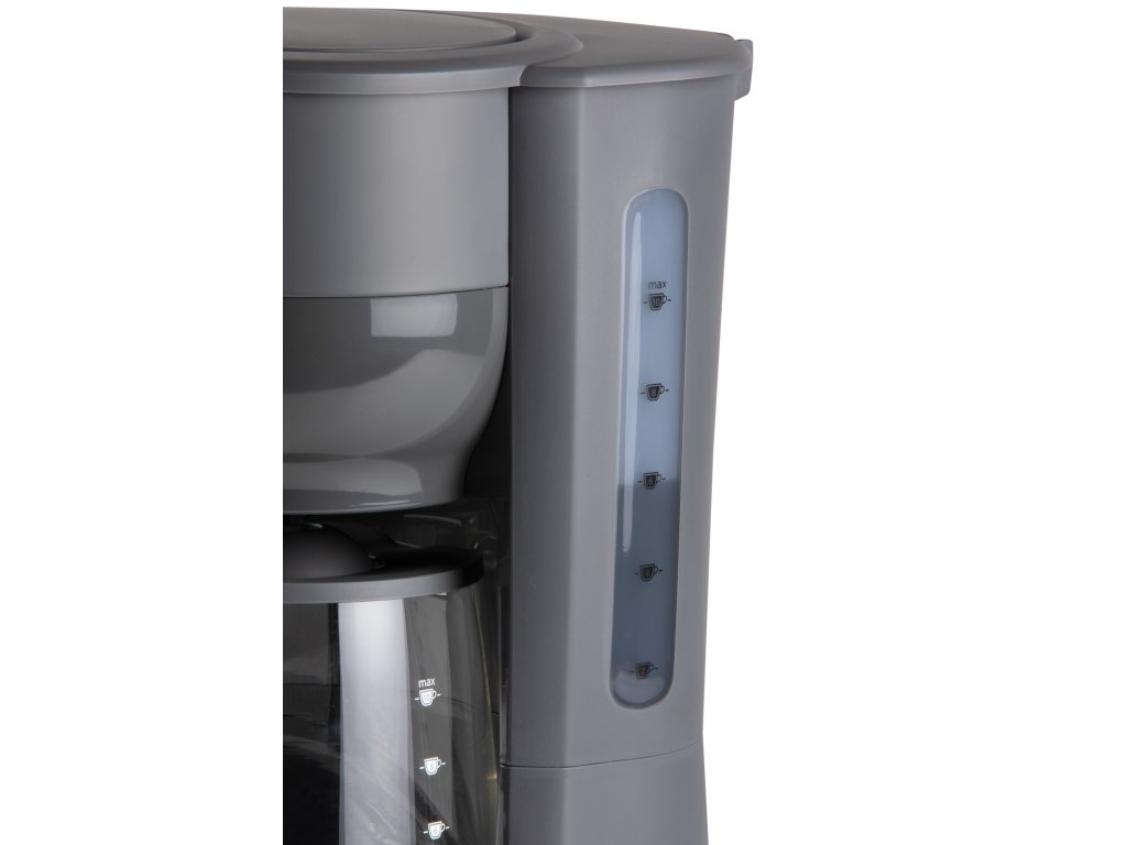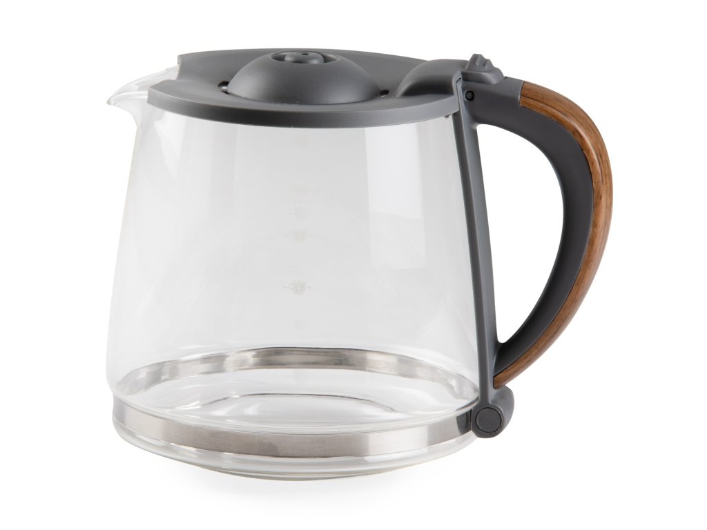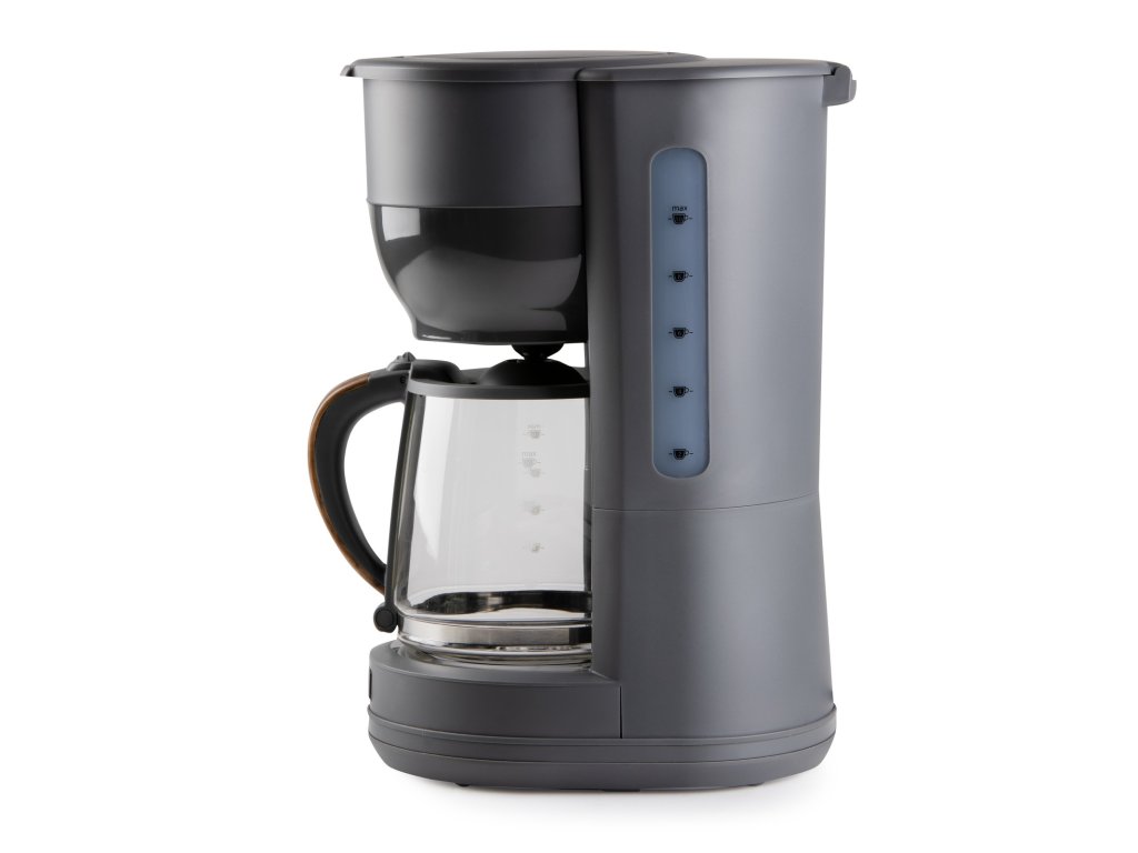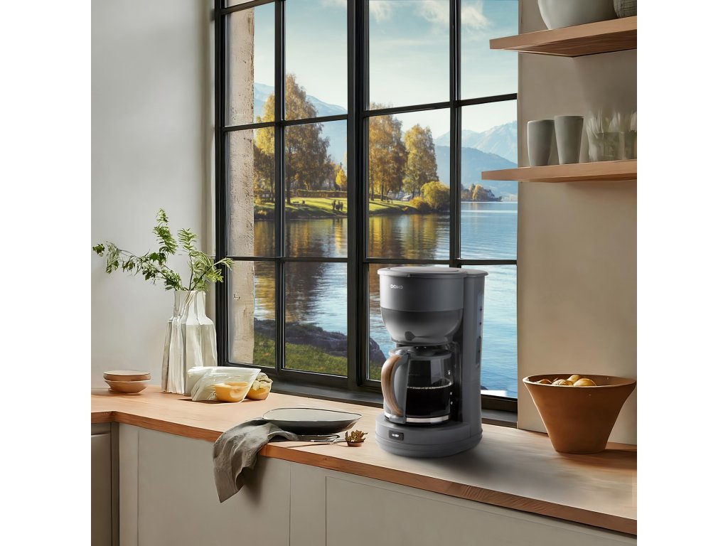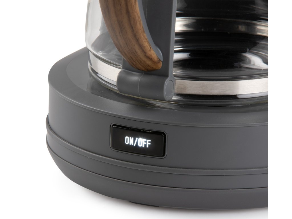 Překapávač na kávu nebo čaj ve stylovém šedém designu s automatickým vypnutím při nečinnosti. Elegantní design doplňuje skleněná konvice s ukazatelem hladiny a stylovou rukojetí ve vzhledu dřeva.