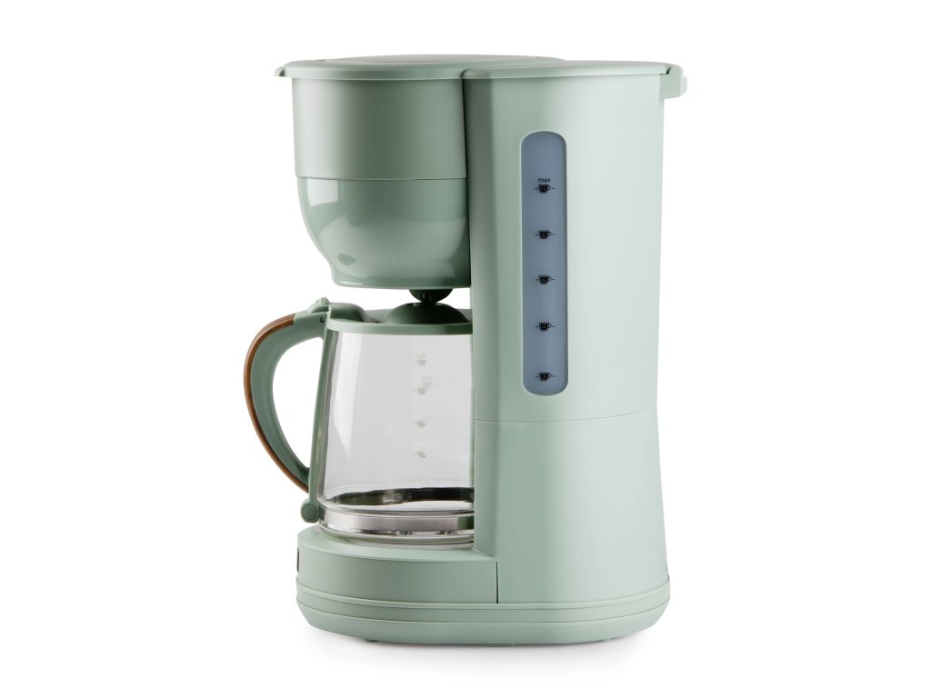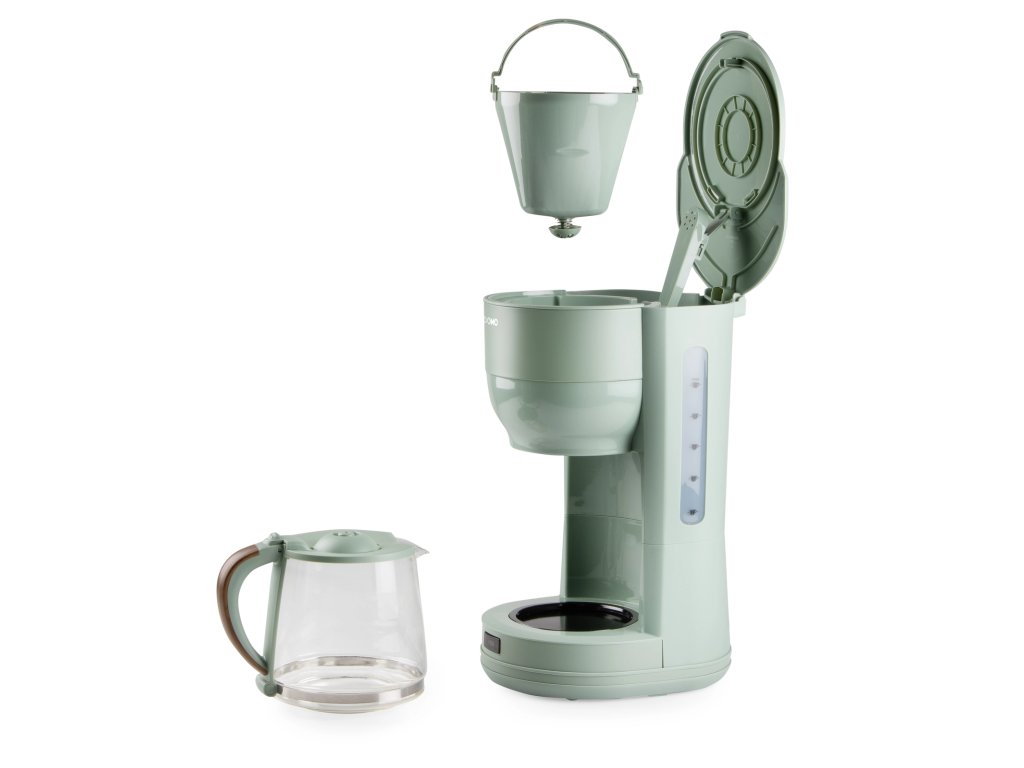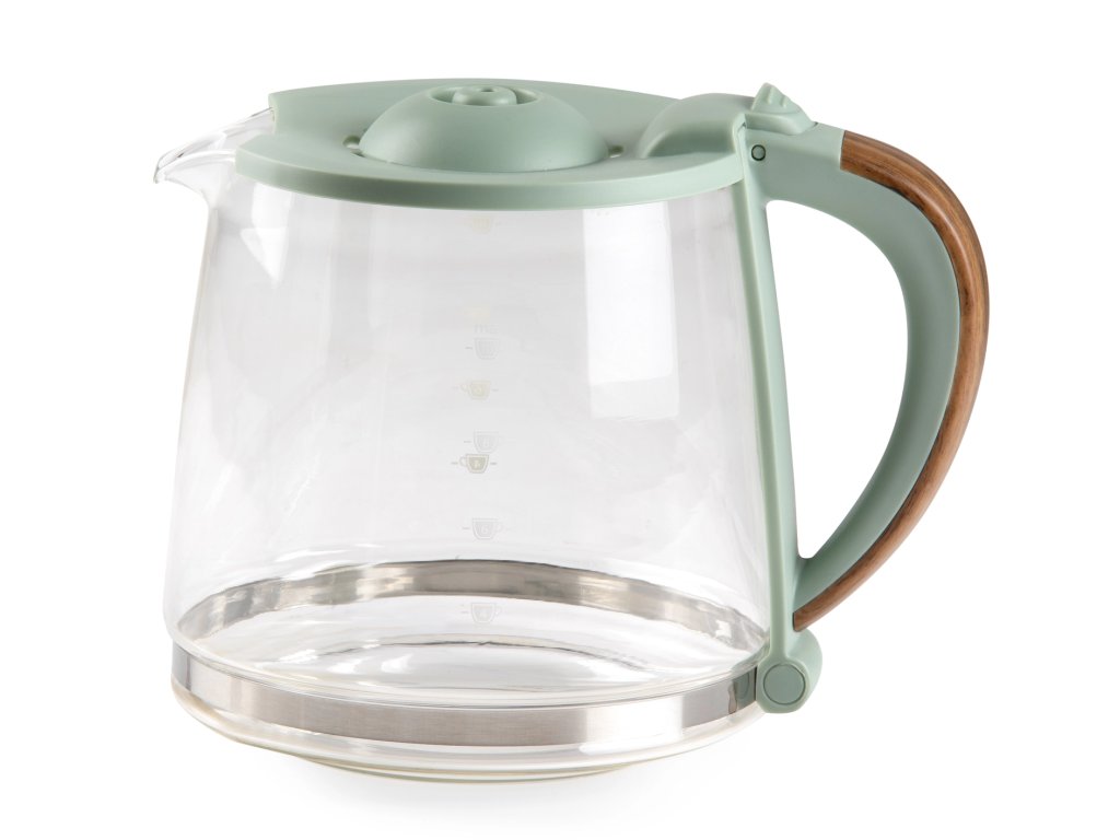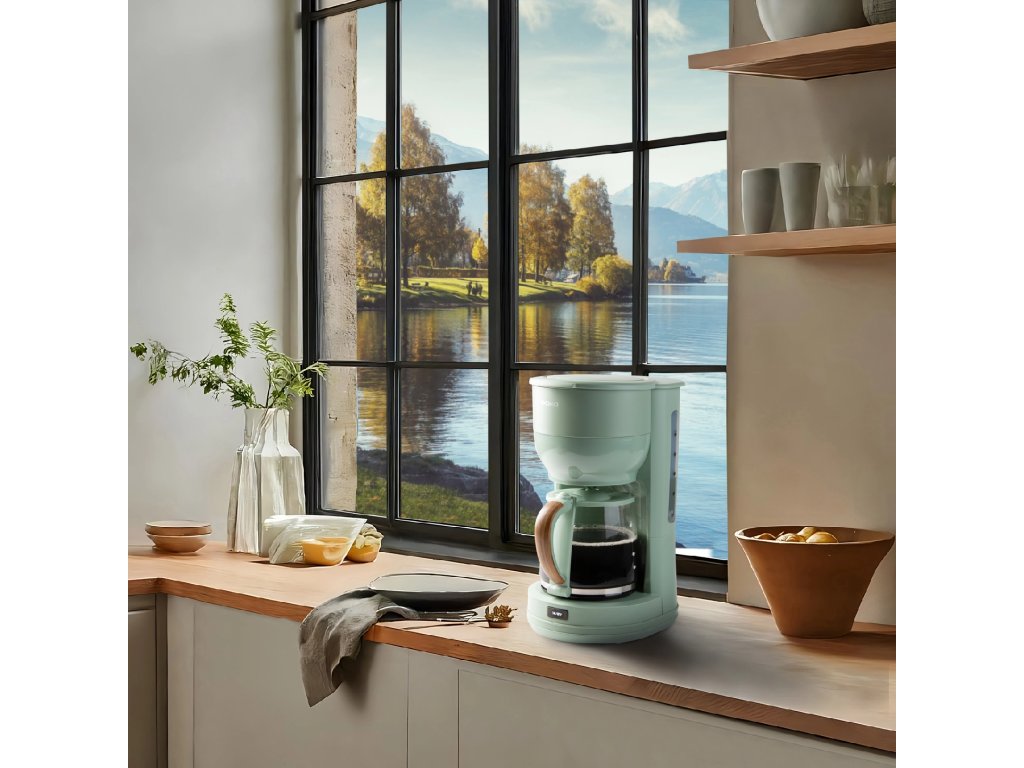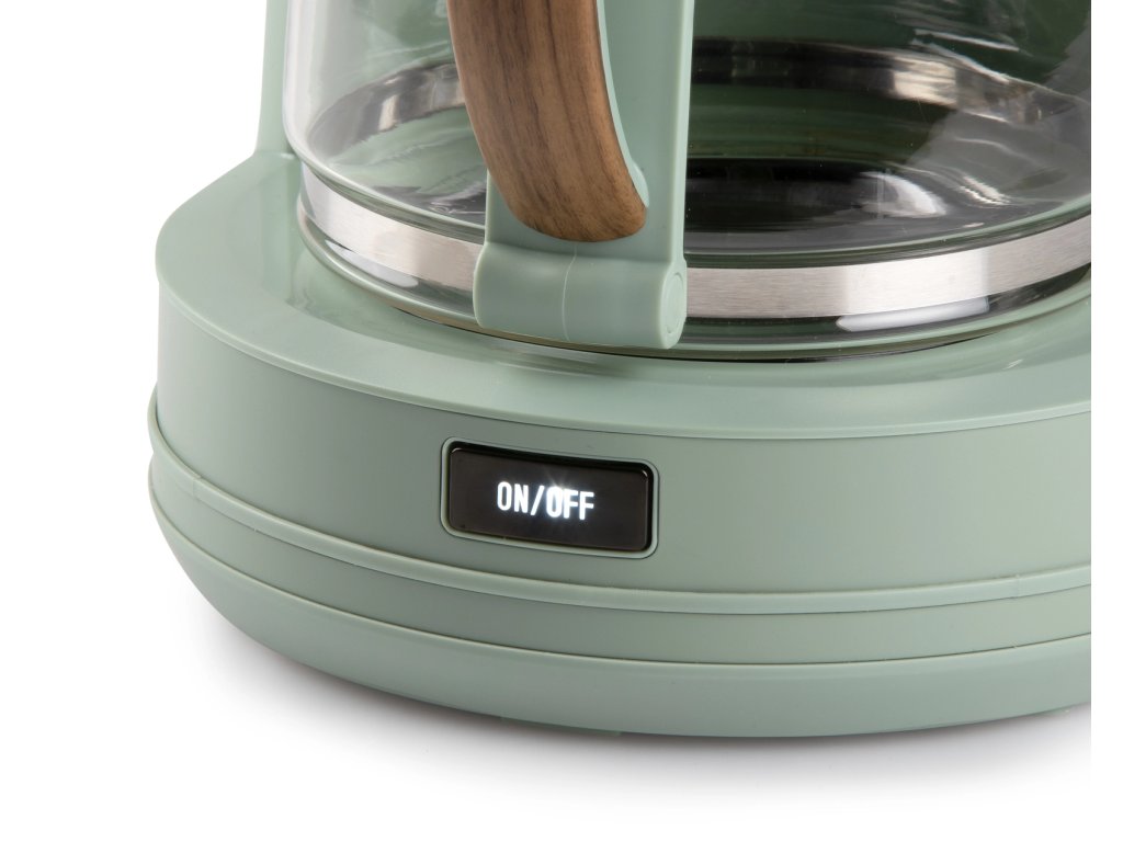Překapávač na kávu nebo čaj ve stylovém zeleném designu s automatickým vypnutím při nečinnosti. Elegantní design doplňuje skleněná konvice s ukazatelem hladiny a stylovou rukojetí ve vzhledu dřeva.