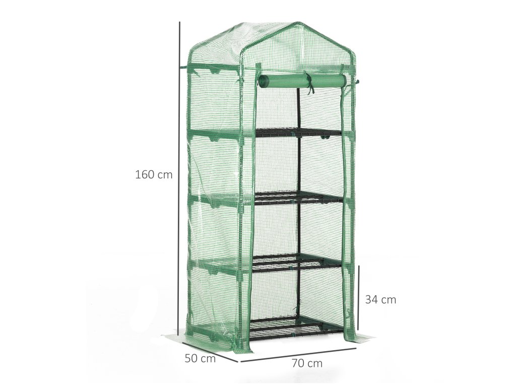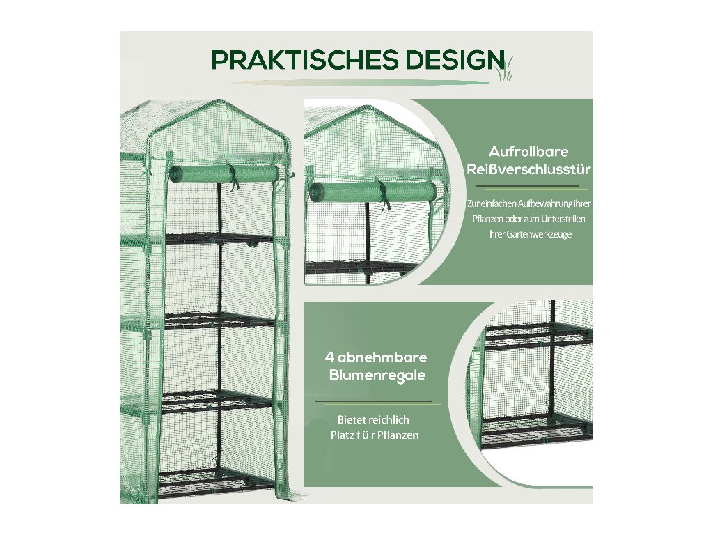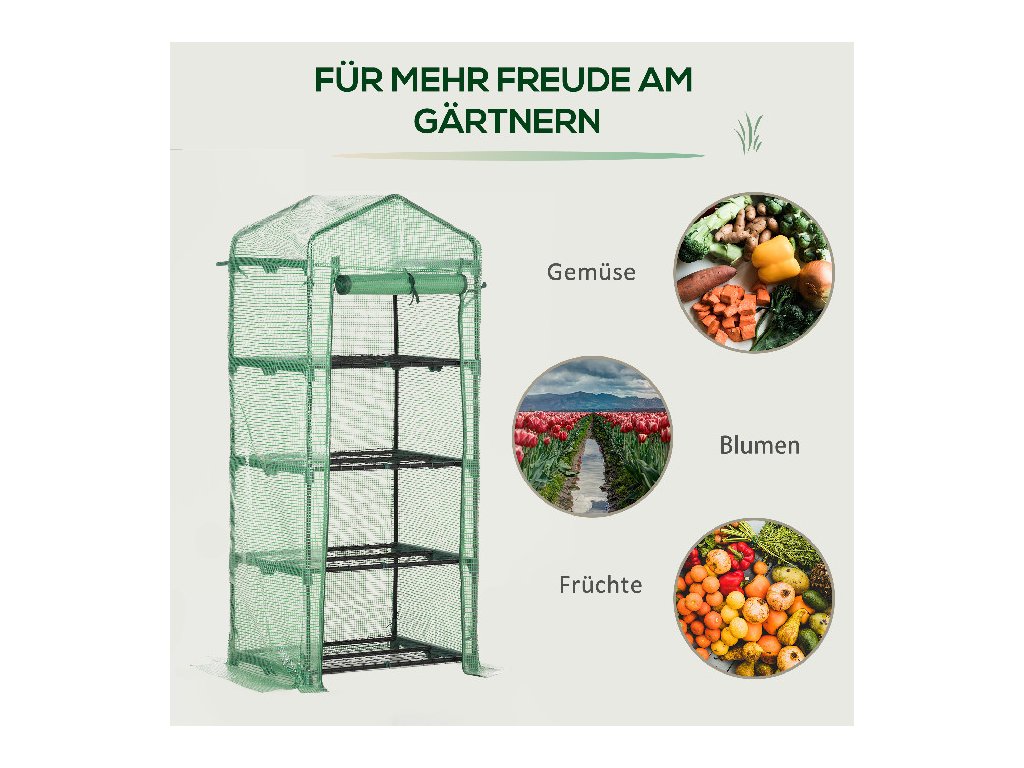 S policí na rostliny: Fóliový skleník je vybaven 4 policemi (výška jedné komory: 34 cm, každá pojme maximálně 15 kg), abyste mohli své rostliny třídit prostorově úsporně a přehledně.