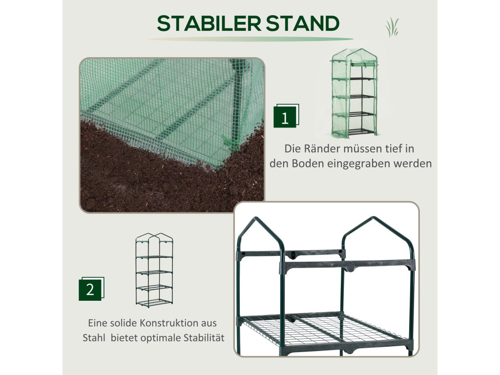 ✔ Tip: Fólie skleníku je na každé straně o 10 cm delší než kovové trubky. Spodní okraj lze zakopat do země nebo zatížit kameny. Díky tomu je skleník stabilnější