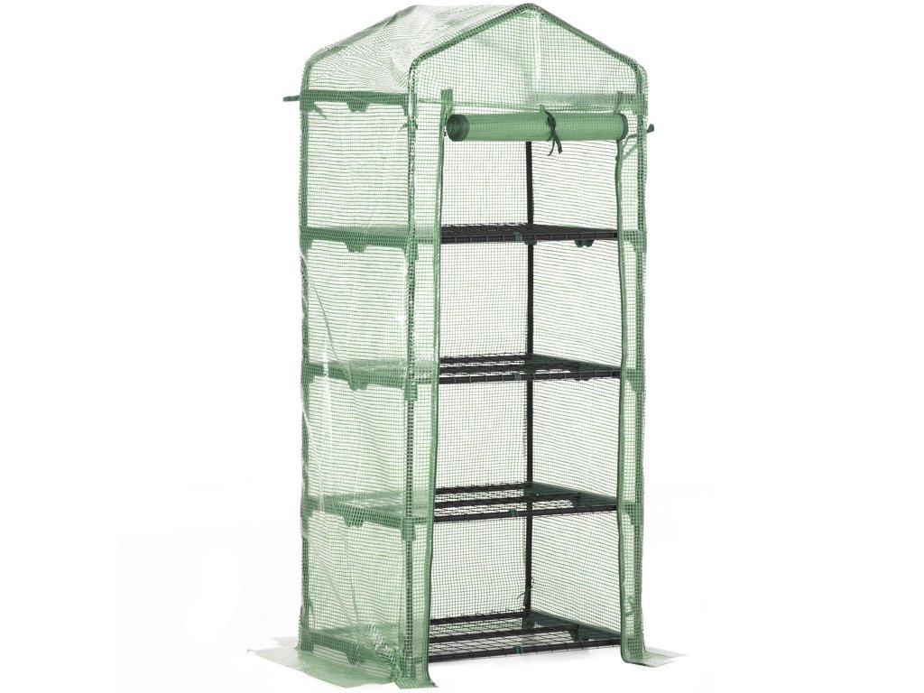 Prosluněný fóliovník 70x50x160cm se 4 policemi na rostliny, studený rám v zelené barvě, ideální pro milovníky zahrad