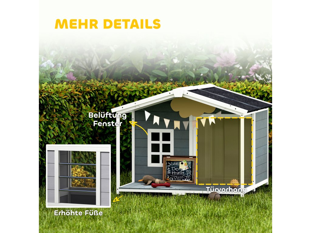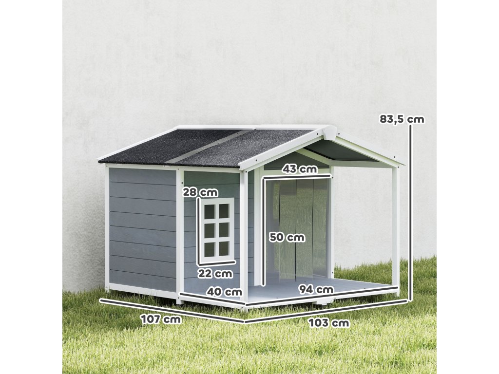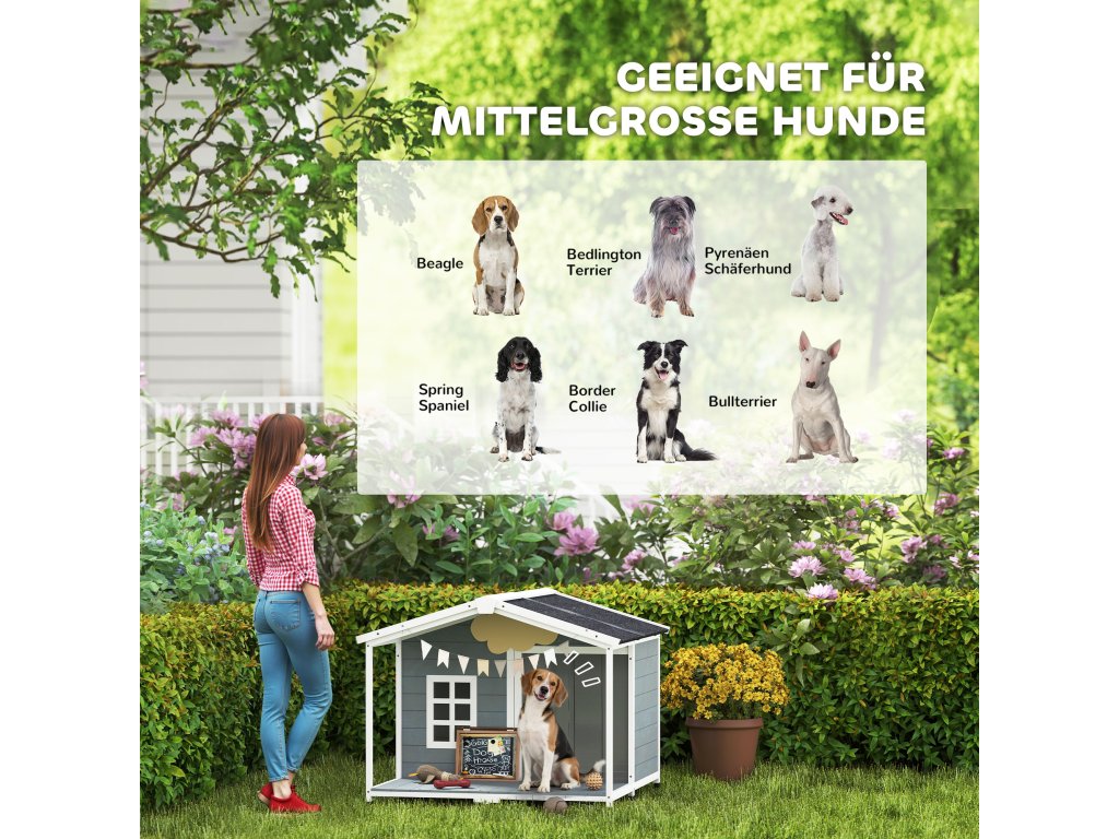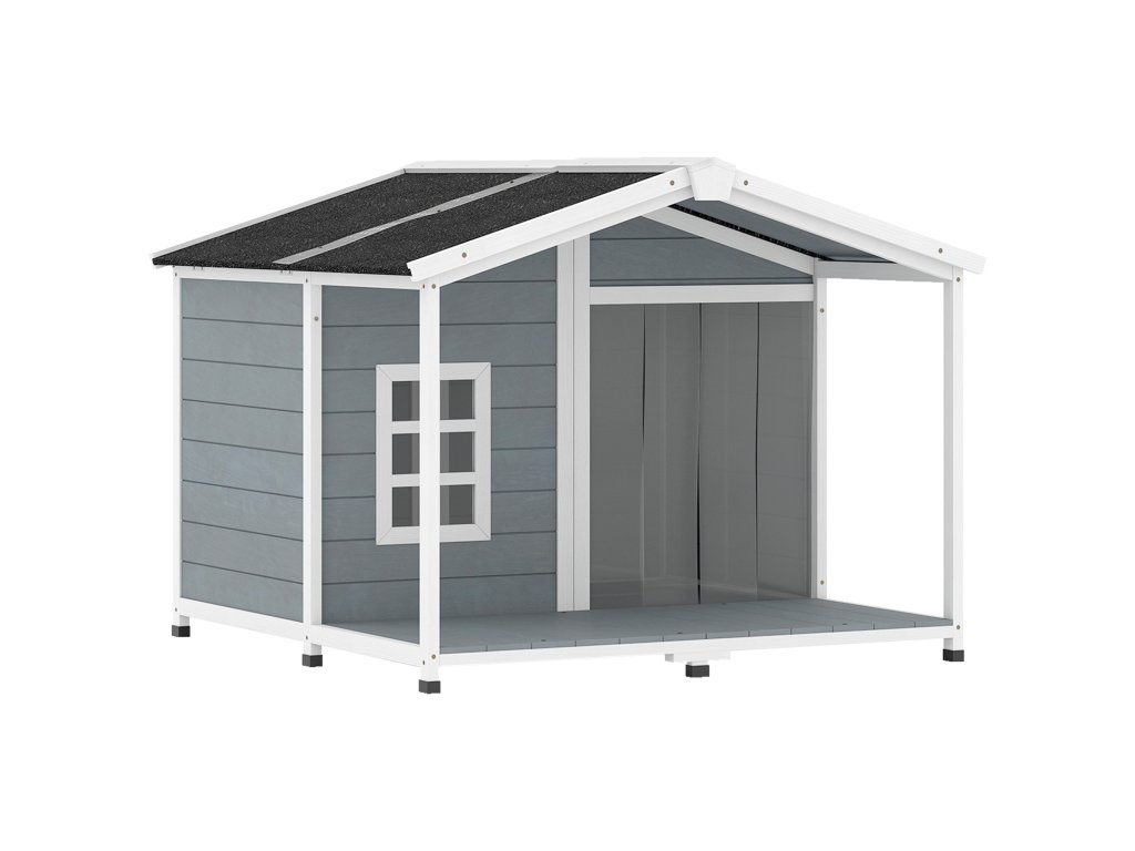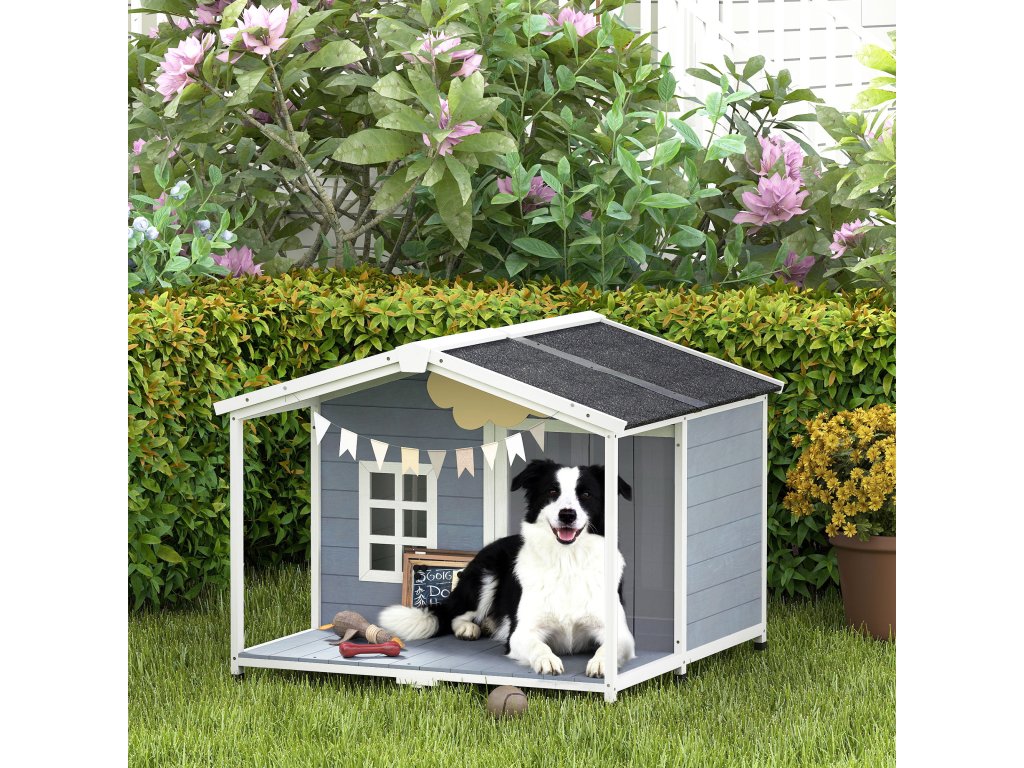 Psí bouda PawHut, odolná proti povětrnostním vlivům, vyvýšená dřevěná psí bouda s asfaltovou střechou a terasou, pro středně velké psy, 103x107x83,5 cm, šedá