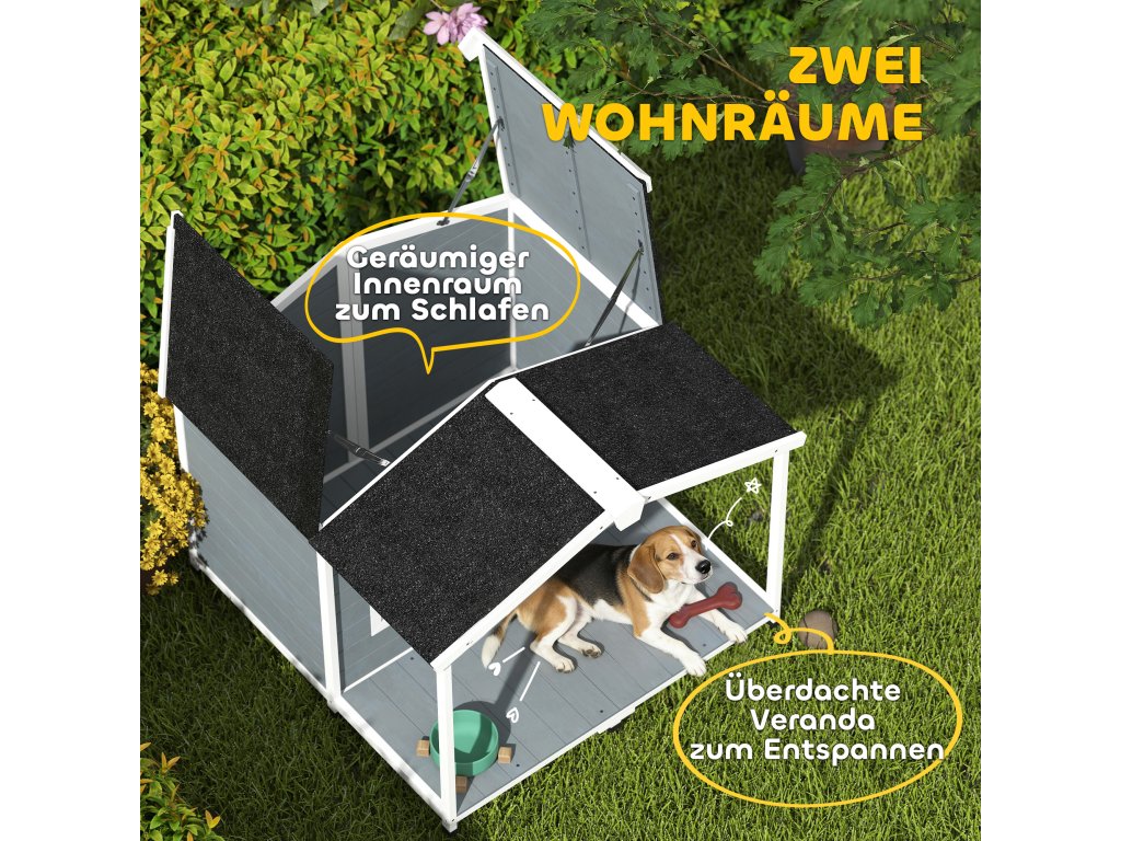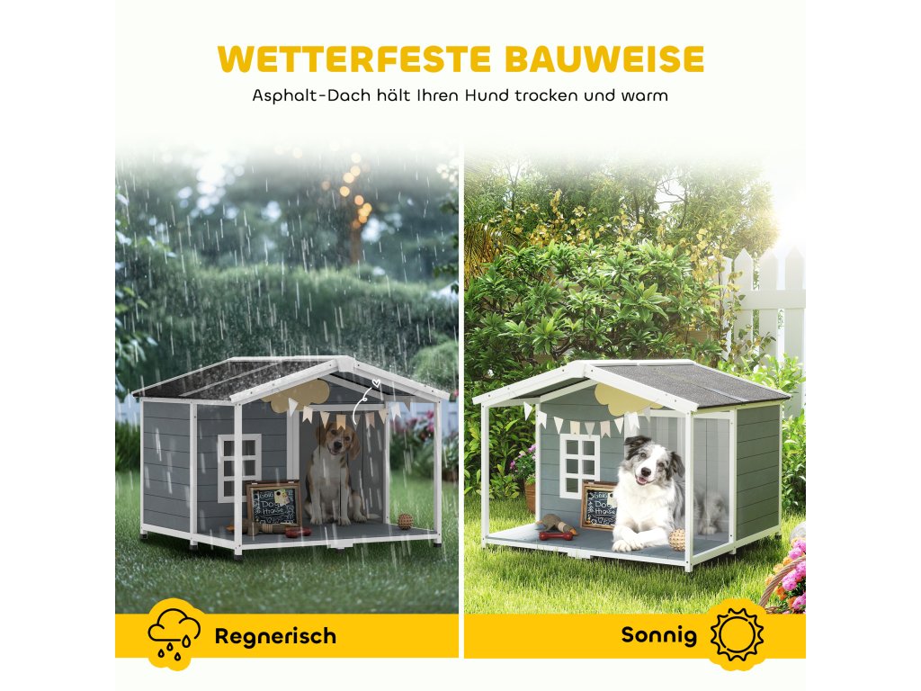 Máte obavy z náhlých lijáků nebo silného slunečního záření, když si váš pes hraje na zahradě? Je stresující, když je obtížné uklidit jeho útočiště. Venkovní psí bouda PawHut nabízí řešení. Její asfaltová střecha chrání před všemi povětrnostními vlivy, zatímco prostorná veranda poskytuje stinné místo. Sklopná střecha a výsuvná podlaha psí boudy usnadňují úklid a poskytují vašemu čtyřnohému příteli pohodlné a suché místo k úkrytu.