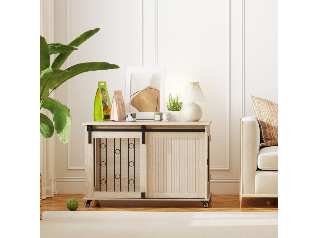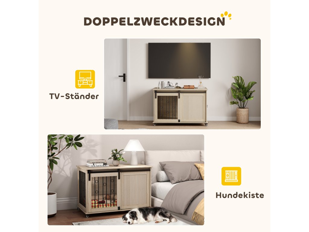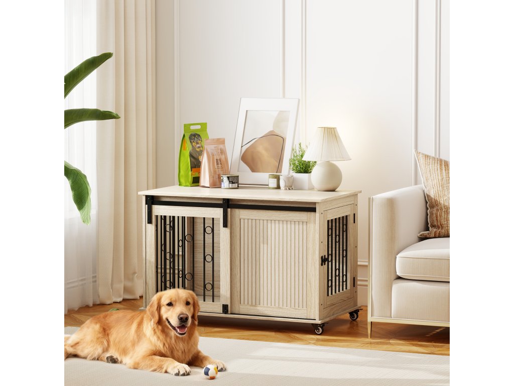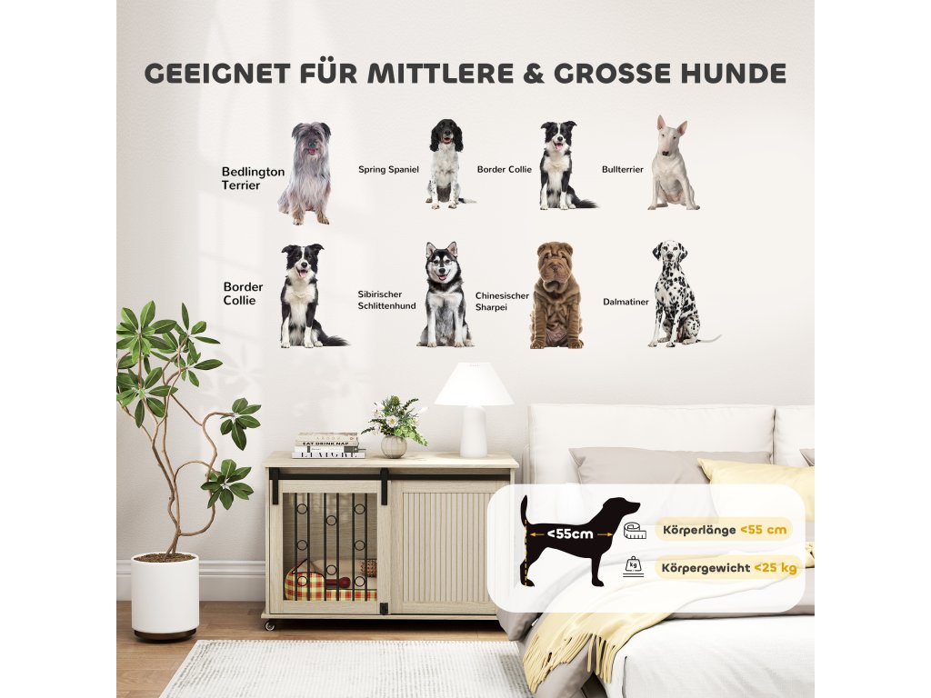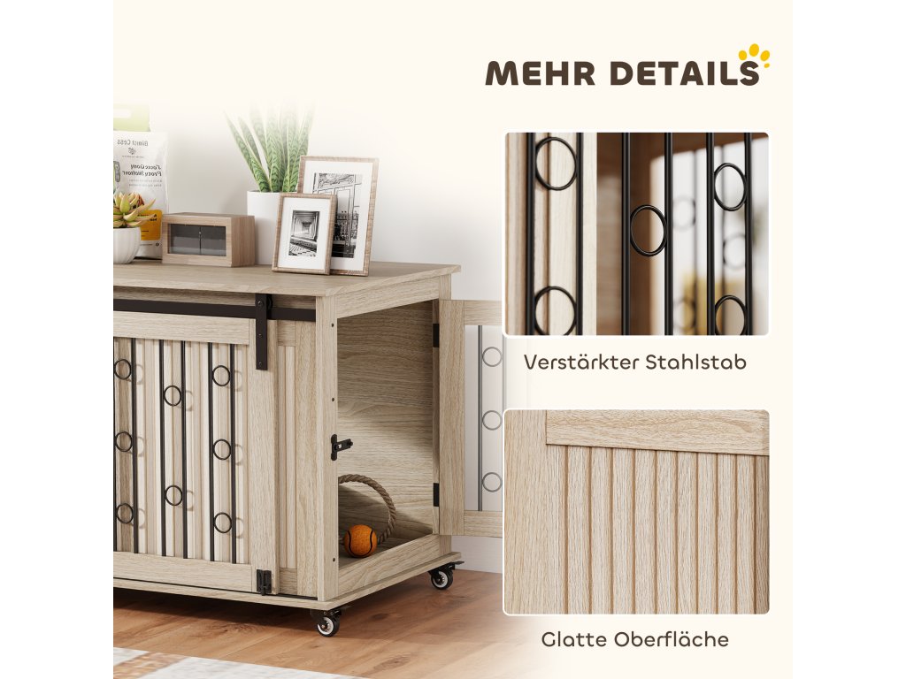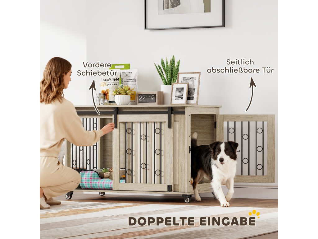 Dvoukřídlé dveře: Vybaveno elegantními posuvnými dveřmi ve stylu stodoly a praktickými bočními dveřmi s robustním zámkem. Tato stylová psí klec se perfektně integruje vedle vaší pohovky a nabízí všestranné možnosti přístupu.