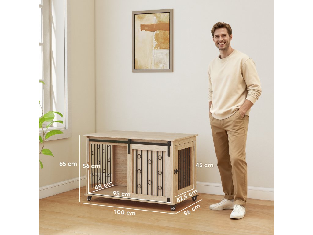 Psí klec PawHut na kolečkách, posuvné dveře, 100 x 56 x 65 cm, dřevo, ocel