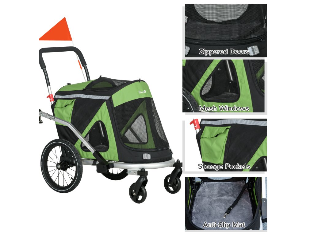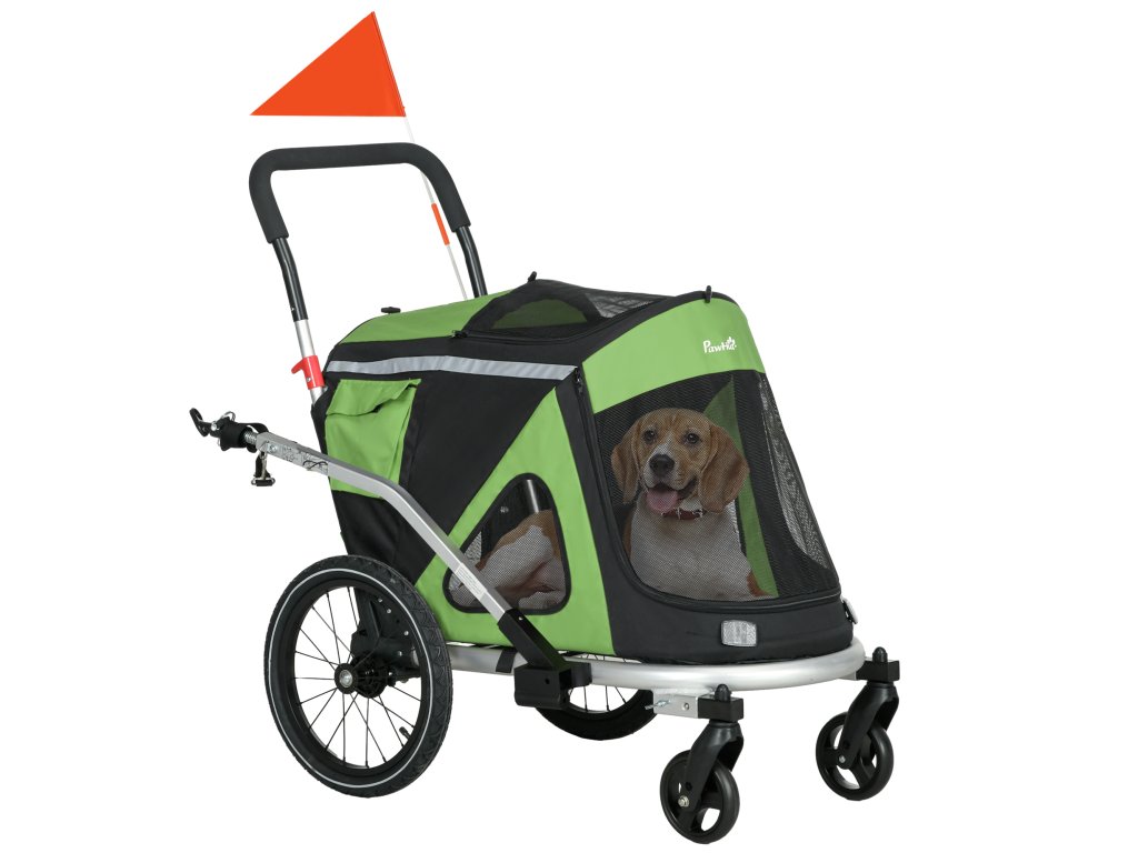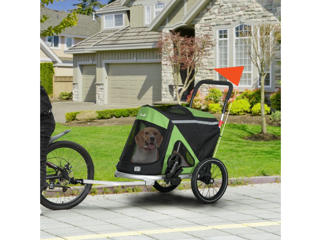 Psí kočárek s přívěsem na kolo do 20 kg 2v1, 2 odrazky, 1 bezpečnostní vodítko 150 x 68 x 95 cm - zelený