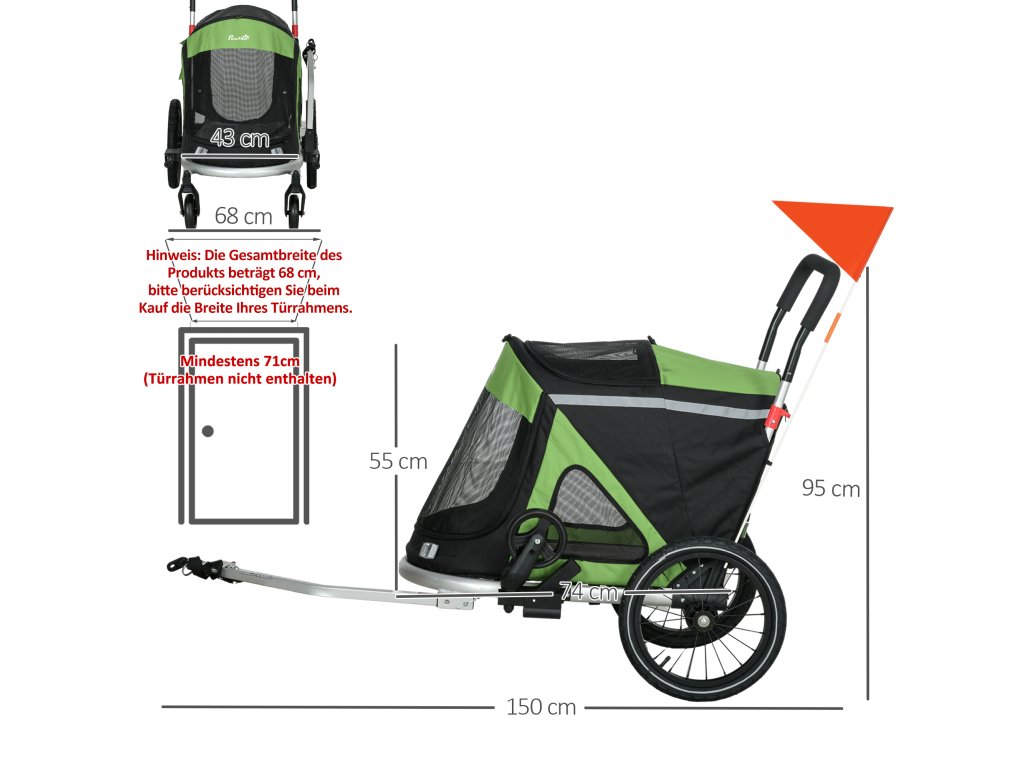 Celkové rozměry (s řídítky): 150D x 68Š x 95V cm. Rozměry vozíku pro psy: 103D x 68Š x 95V cm. Vnitřní rozměry: 74D x 43Š x 55V cm. Složené rozměry: 94D x 68Š x 39V cm (s kolečky), 74D x 43Š x 20V cm (bez koleček). Vhodné pro středně velké psy do 20 kg a délky těla menší než 49 cm. Nutná montáž. Upozornění: Pokud cestujete s přívěsem, změřte si předem velikost zavazadlového prostoru.