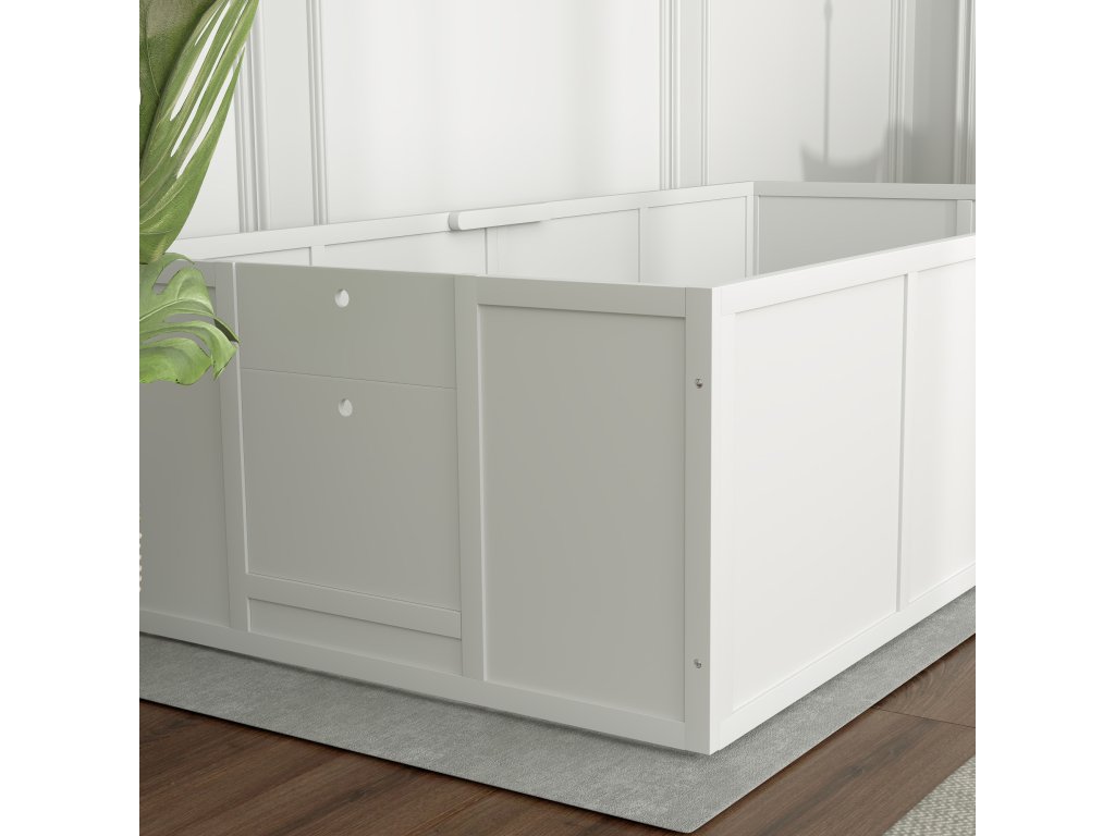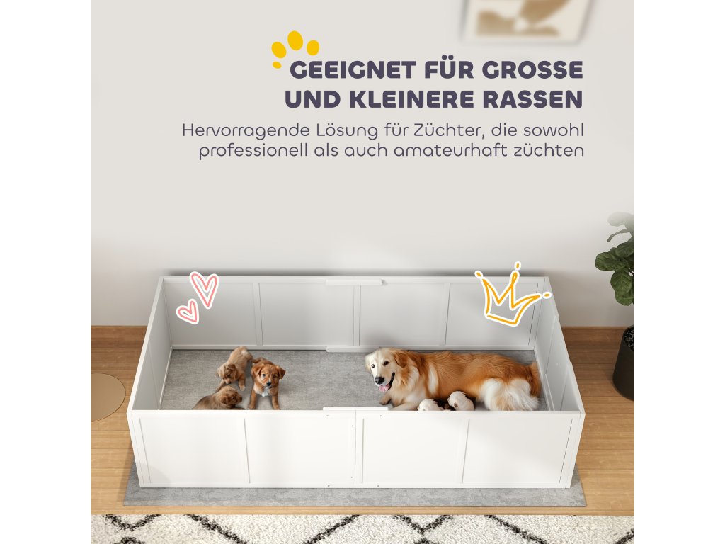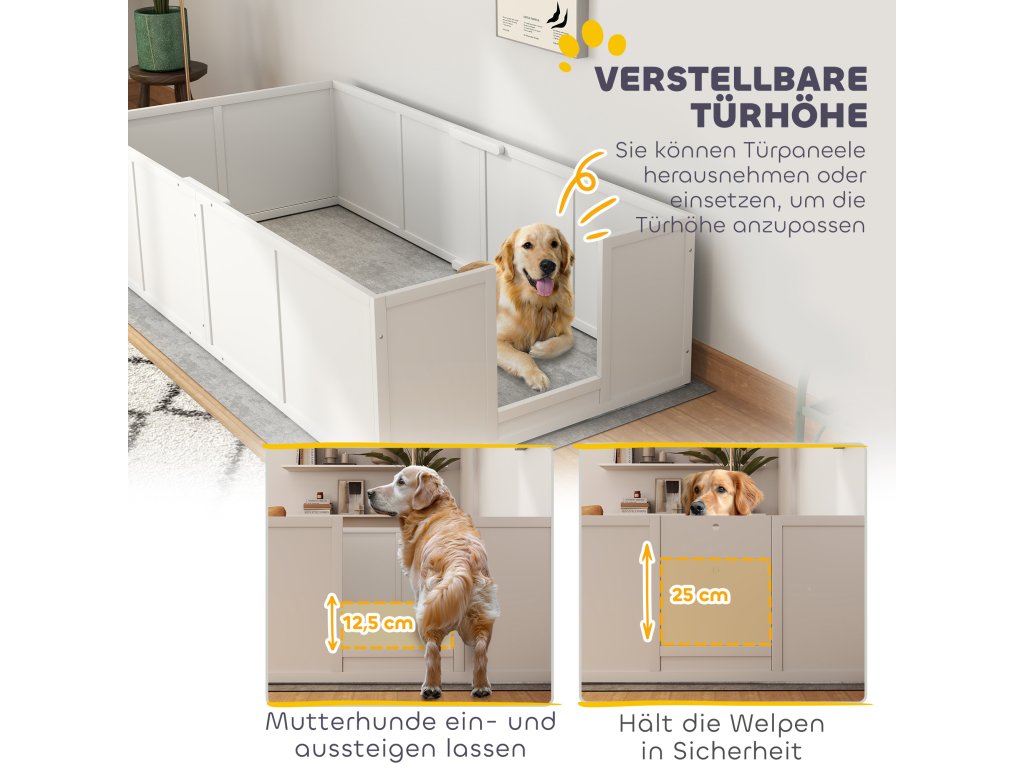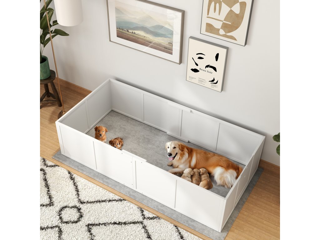 - Robustní konstrukce: Tento výběh pro štěňata je vyroben z borovicového dřeva a MDF a poskytuje robustní a bezpečný prostor pro porod a péči o štěňata