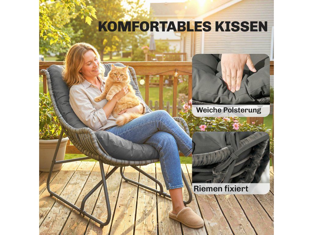 Maximální pohodlí při sezení: Naše ratanová zahradní židle s polštářem vám nabízí ideální místo k relaxaci. Vysoce kvalitní polštář je bezpečně připevněn k židli pomocí popruhů, aby se zabránilo uklouznutí a poskytlo vám dokonalý relaxační zážitek.