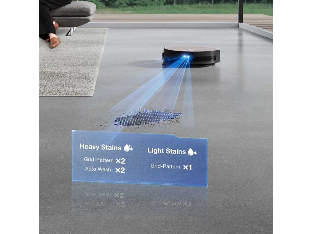 Už žádná skvrna nezůstane nepovšimnuta. Robotický vysavač ECOVACS DEEBOT X11 OMNICYCLONE pomocí kamery a umělé inteligence vyhledá skvrny a fleky a přizpůsobí strategii čištění na základě jejich závažnosti, dokud nezmizí. U lehkých skvrn (například mléko nebo džus) provede čištění oblasti třemi přechody tam a zpět. U odolných skvrn (například sójová omáčka nebo káva) provede důkladný vícestupňový proces: hluboké čištění mřížkovým vzorem od okrajů do nitra oblasti, automatické vyčištění mycího válce vysoce účinným čistícím prostředkem ve stanici a druhý cyklus čištění mřížkovým vzorem. Na rozdíl od konkurence nečistí opakovaně celou místnost, ale v reálném čase se zaměří jen na znečištěnou oblast. Tím maximalizuje účinnost čištění a pokaždé zaručuje důkladné vyčištění.