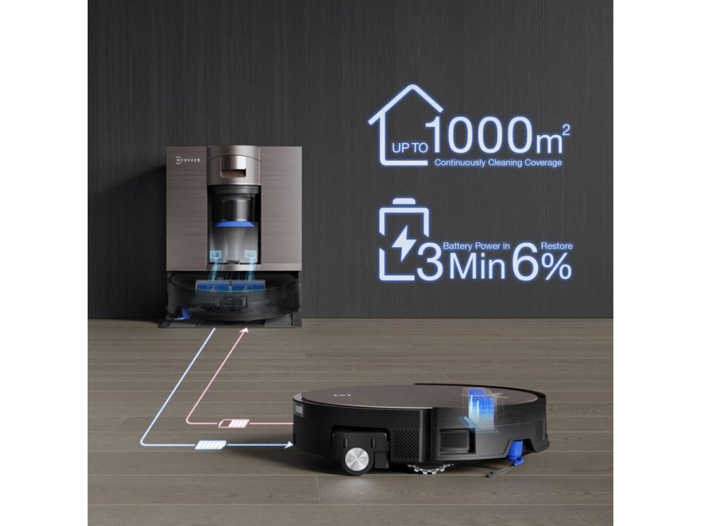 · Automatické dávkování čisticíhoprostředku Intelligent Hosting automatické čištění pomocí umělé inteligence: ano· AI Stain Detection 2.0 cílené čištění skvrn pomocí umělé inteligence: ano· Video strážník domácnosti: Home Keeper (pohled živě, plánované hlídání domácnosti, ukládání videí a fotek, obousměrná komunikace, ochrana údajů A NAVIGACE · Inteligentní vyhýbání se překážkám: Technologie AIVI® 3D 3.0 s umělou inteligencí (AI kamera, 3D ToF LiDAR, umělá inteligence)· Přídavné LED světlo pro noční vidění: ano· Technologie navigace: AINA 2.0·Navigace pomocí laseru2.0: ano VYSÁVÁNÍ · Sací výkon: 19 500 Pa (technologie BLAST™)· Suction Boost automatické zvýšení výkonu na kobercích: ano· Úrovně sacího výkonu: 4· Objem zásobníku na prach (robot): 220 ml· Omyvatelný vysokoúčinný filtr: ano MOPOVA . (mycí válec s technologií permanentního samomytí)· Dry-Wet Separation inteligentní zvedání hlavního kartáče a bočního kartáčku: ano· Auto-Lift Mopping inteligentní zvedání mopu: o 10 mm· Inteligentní hluboké mopování dle množství znečištění:ano·vody: 3 + vlastní nastavení· Objem zásobníku na vodu (robot): 110 ml (čistá voda) + 90 ml (špinavá voda) OMNI STANICE · Typ stanice: bezsáčková OmniCyclone· Automatické čištění mopů horkou vodou: řízená teplota 40 ~ 75 °C·Sušení mopů teplýmAutomatické vyprázdnění prachu a doplnění vody: ano· Objem nádrže na čistou / špinavou vodu: 3,2 l / 2,7 l· Objem prachového sáčku: 1,6 l (nádoba)· Režim samočištění stanice: ano BATERIE A NABÍJENÍ · Výdrž baterie: s PowerBoost:Bo: ∈6 400 mAh· Typ baterie: Li-Ion