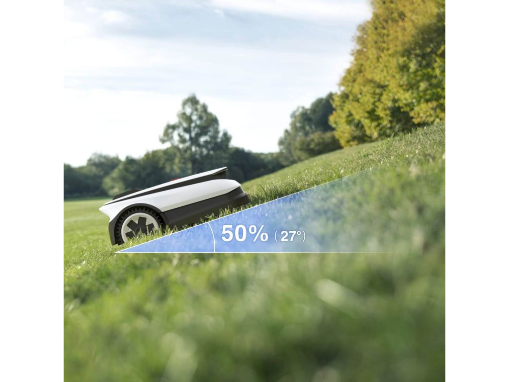 - Poradí si i s náročnějším terénem se svahy až do sklonu 50% (27°), je mimořádně tichá a super rychle se dobije a pokračuje v sečení