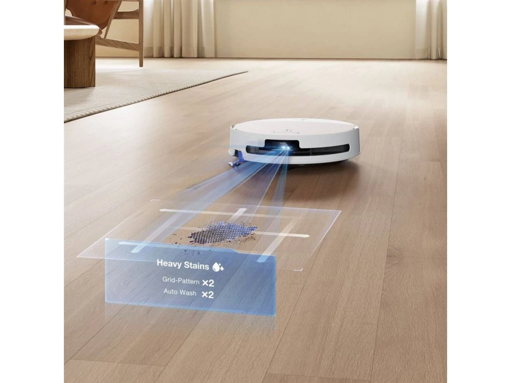 Už žádná skvrna nezůstane nepovšimnuta. Robotický vysavač ECOVACS DEEBOT T90 OMNI pomocí kamery a umělé inteligence vyhledá skvrny a fleky a přizpůsobí strategii čištění na základě jejich závažnosti, dokud nezmizí. U lehkých skvrn (například mléko nebo džus) provede čištění oblasti třemi přechody tam a zpět. U odolných skvrn (například sójová omáčka nebo káva) provede důkladný vícestupňový proces: hluboké čištění mřížkovým vzorem od okrajů do nitra oblasti, automatické vyčištění mycího válce ve stanici a druhý cyklus čištění mřížkovým vzorem. Na rozdíl od konkurence nečistí opakovaně celou místnost, ale v reálném čase se zaměří jen na znečištěnou oblast. Tím maximalizuje účinnost čištění a pokaždé zaručuje důkladné vyčištění.