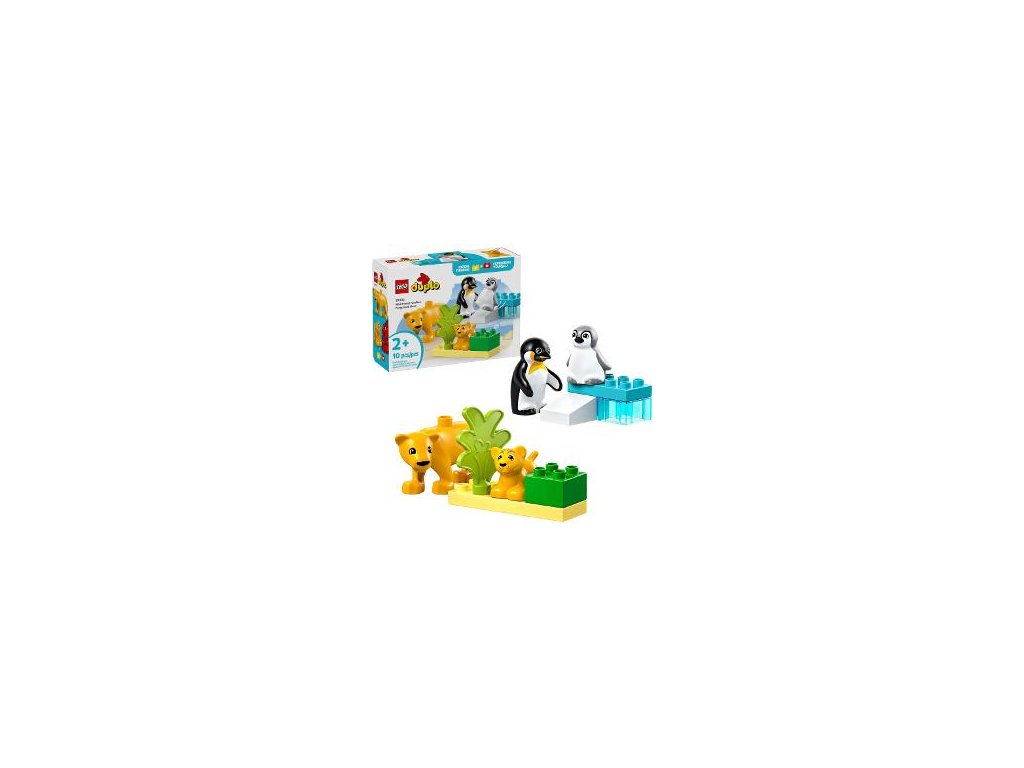 Součástí této stavebnice jsou 2 biotopy z kostek a 4 figurkyzvířátek LEGO® DUPLO®: Dospělý tučňák s mládětem a lvice s lvíčetem