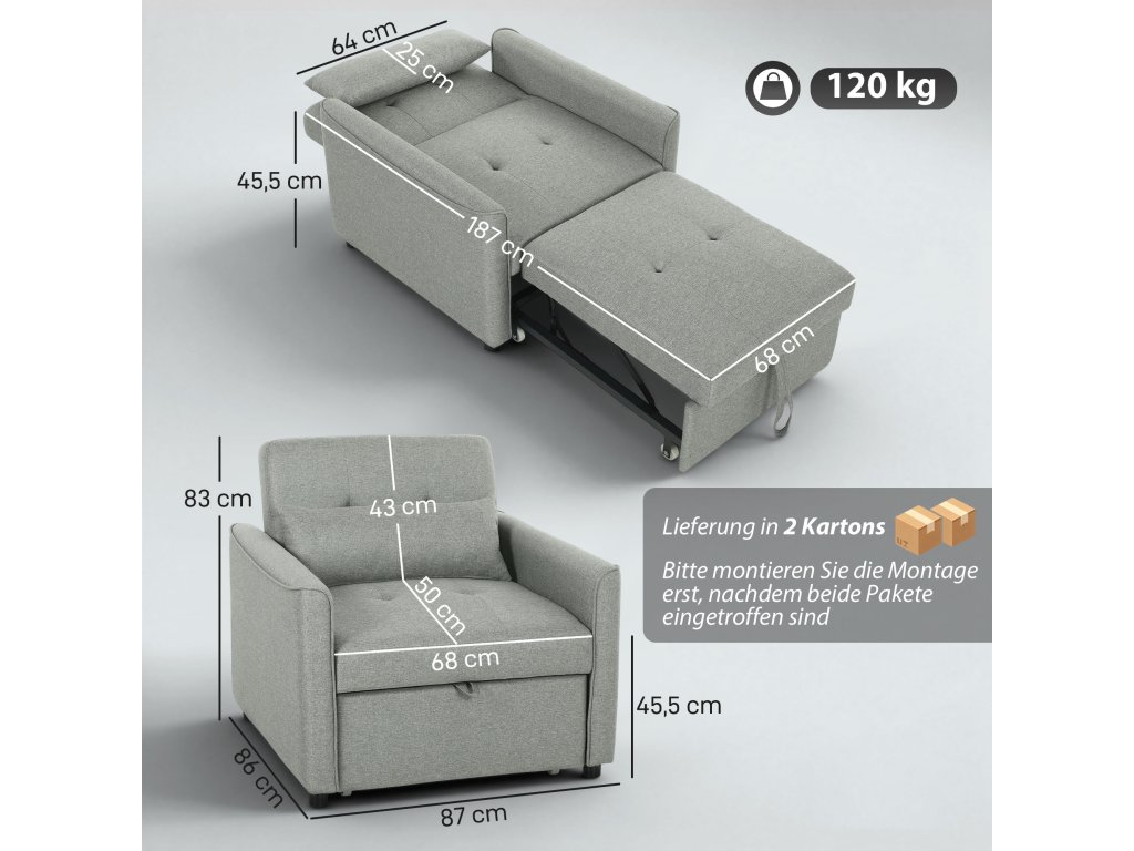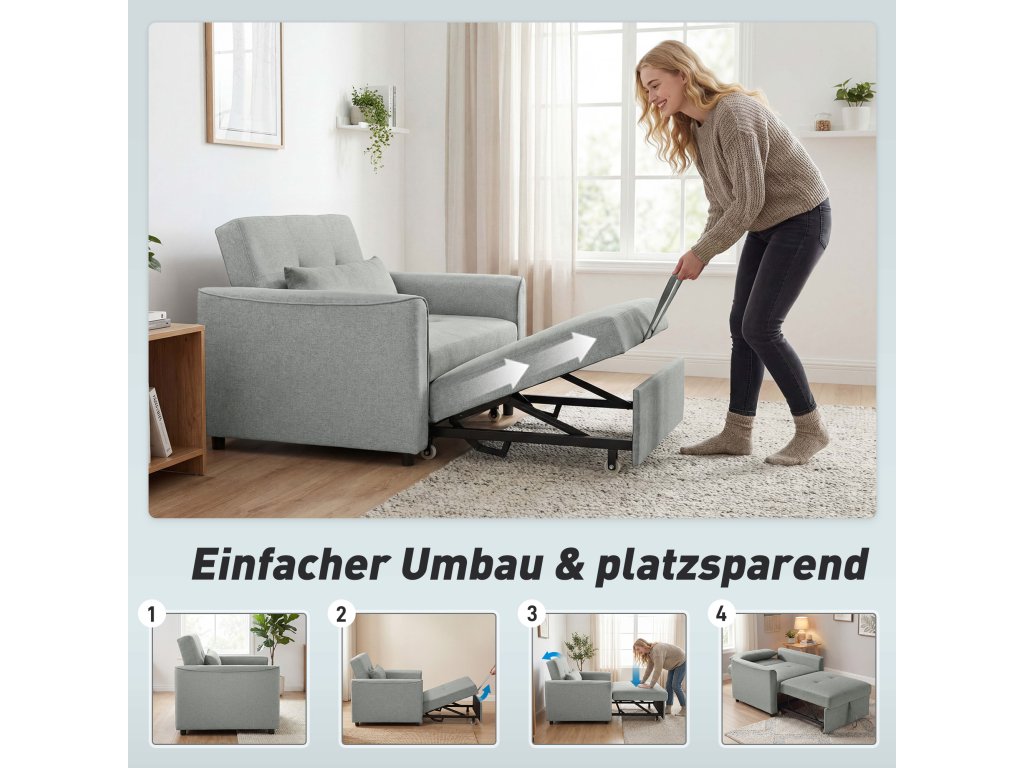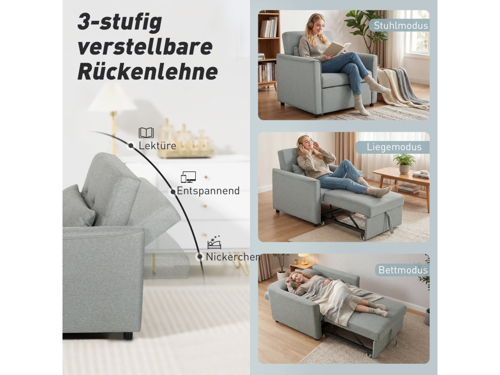 Rozkládací křeslo HOMCOM 3 v 1, rozkládací pohovka s nastavitelným opěradlem, šedá