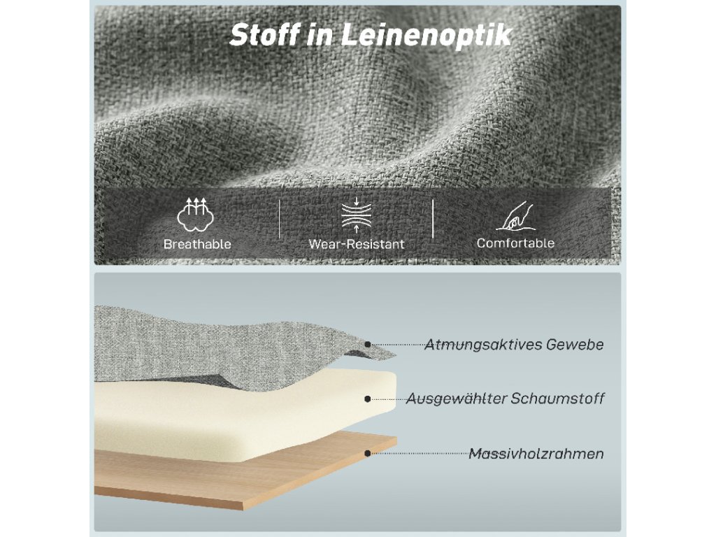 ✔ Materiál: Látka s imitací lnu (100% polyester), pěna, eukalyptové dřevo, kov, plast