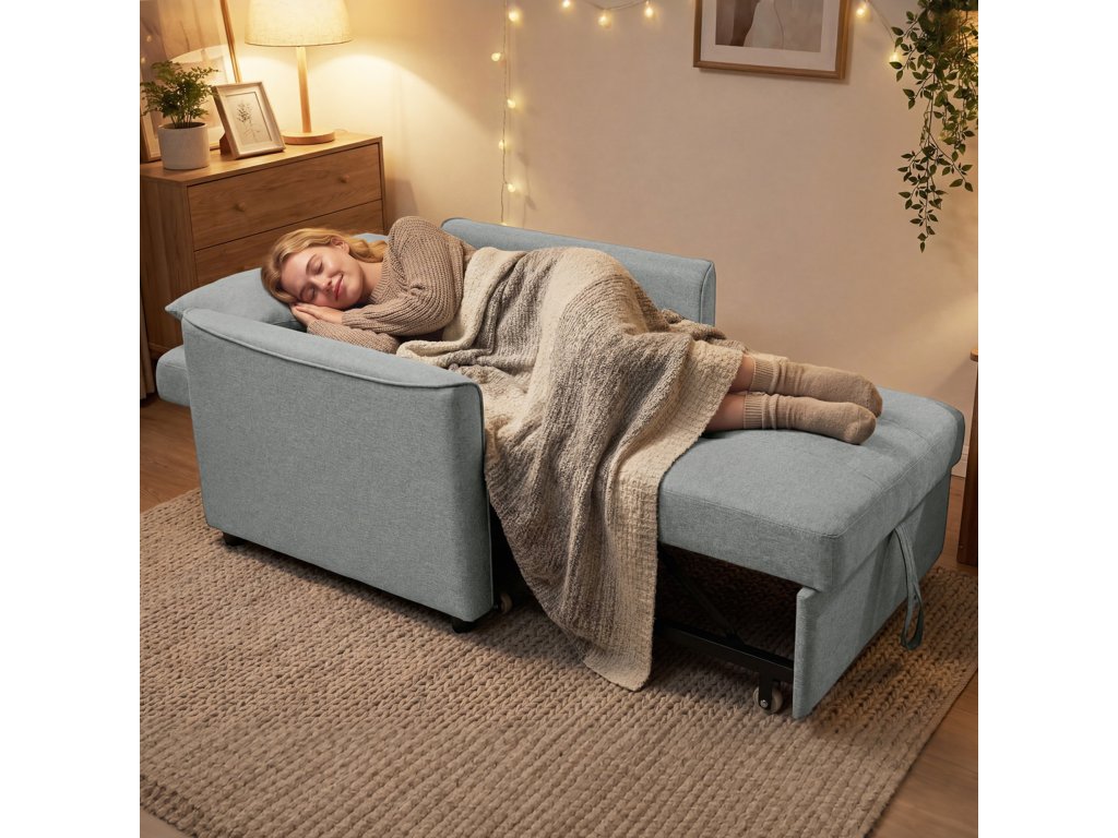 Všestranný 3v1 design: Během několika sekund se promění z křesla na lehátko nebo postel. Hladký popruh a kolečka umožňují snadný pohyb – ideální pro malé prostory a hosty.